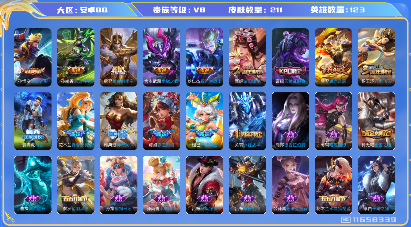 [11658339]V8 1典藏 5传说 123英雄 211皮肤 可修改实名 优质装备:全息碎影(猴子典藏),黄金射手座,末日机甲-孙尚香(绿蚂蚱),地狱之眼,超时空战士-狄仁杰 珍宝阁皮:优雅恋人 限定皮:梅西,遇见飞天,冰锋战神,游园惊梦,天狼征服者,辉光之辰,霸王别姬-虞姬,青春决赛季,热情桑巴,神奇女侠 史诗皮:白龙吟,特工魅影,千年之狐,无限星赏官,冰冠公主,偶像歌手,暗夜猫娘,末日机甲-吕布,猫狗日记-孙策,水果甜心,星夜王子,心灵骇客,德古拉伯爵,幽灵船长,心灵战警,繁星吟游(呼啦呼啦),逐浪之夏,水晶猎龙者,箭羽风息,原初追逐者,圣诞狂欢,鹰眼统帅,王者之锤,暗夜贵公子,魅力维加斯,未来纪元-赵云