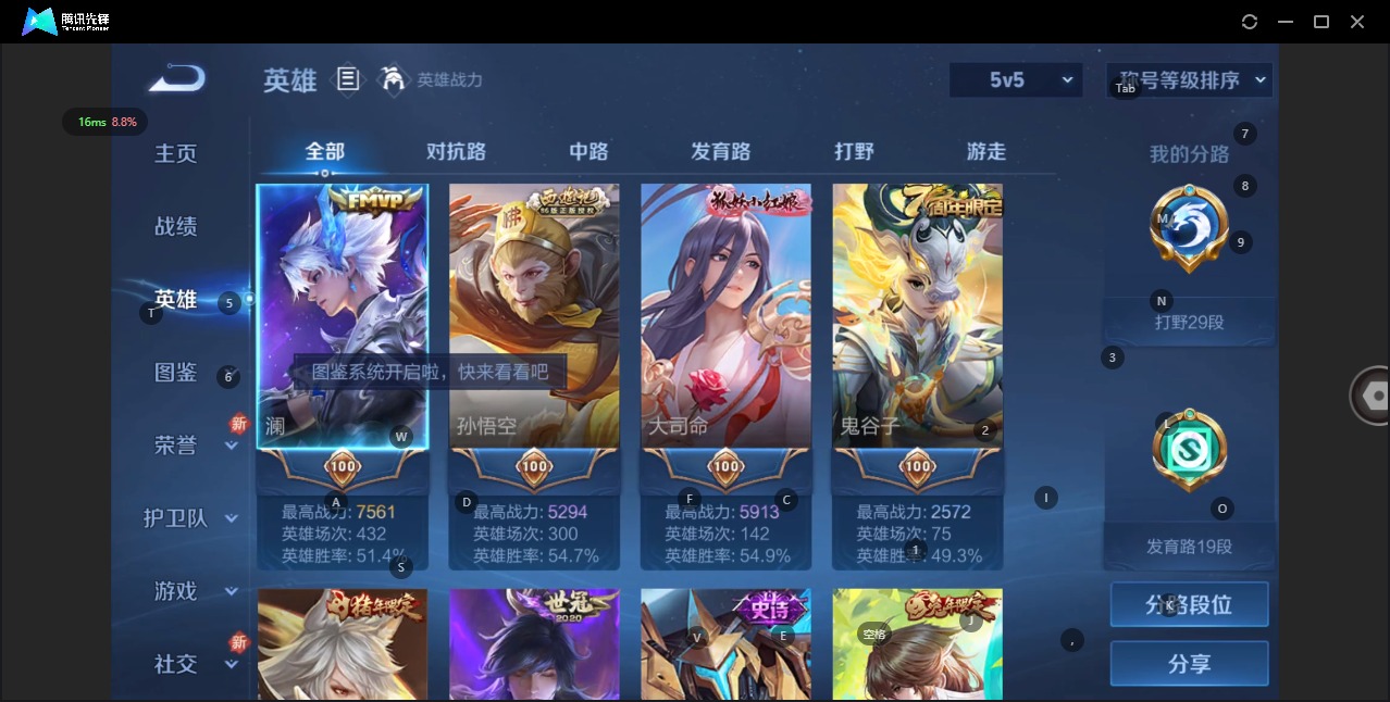 - [36997]英雄数: 86 皮肤数: 2 勇者皮肤数: 46 史诗皮肤数: 10 传说皮肤数: 1 稀有英雄: 艾琳,娜可露露,不知火舞,桑启,戈娅 当前段位: 星耀 限定皮肤: 高山流水,五谷丰年 内测皮肤: 女武神 史诗皮肤: 逐浪之夏,水果甜心,乘风破浪,水晶猎龙者 赛季/战令皮肤: 朔风刀,混沌棋,疑决卦,醍醐杖,原初探秘者,万华元夜,演武夺筹,驱傩正仪,千军破阵,星际陆战队(达摩),金庭之子,大漠名商,云中旅人,海盐诗旅 实名: 有人脸修改机会/实名是本人 普通皮肤: 五福同心,龙腾万里,归虚梦演(鲁班大师),归虚梦演(曜),掌控之力,守护之力,化身博士,缤纷绘卷,黄金武士,天使之翼,红桃皇后,星际陆战队(程咬金),阴阳师,汉昭烈帝,兔女郎,死亡骑士,救世之瞳,白色死神,野性能量,冰雪圆舞曲,露花倒影,花见巫女,未来旅行,龙域领主,蔷薇王座,万圣前夜,异域舞娘,潮流仙人,东海龙王,战争女神,精灵王,加勒比小姐,死神来了,赤焰之缨,启蛰,棒球奇才,海之征途,精准探案法,花间舞,绝影神枪,阿摩司公爵,特种部队,隐刃,木偶奇遇记,海军大将,一千零一夜,英喵野望,前尘,碧珀绯影