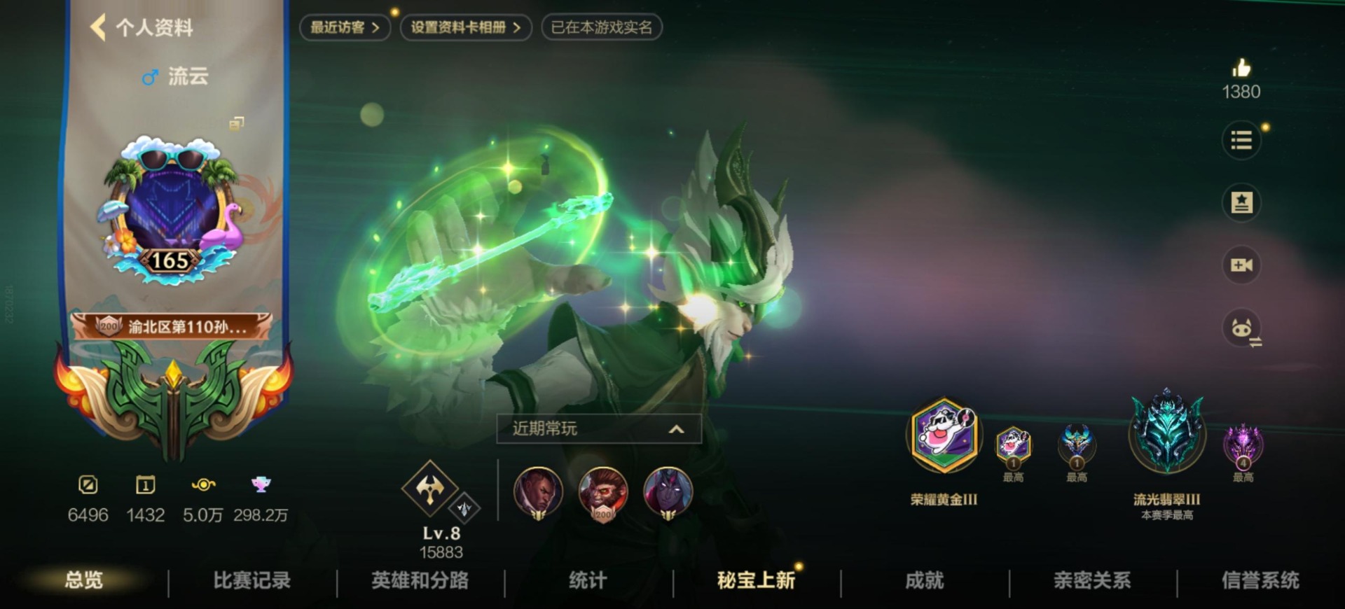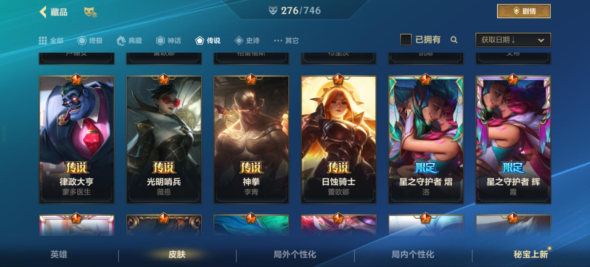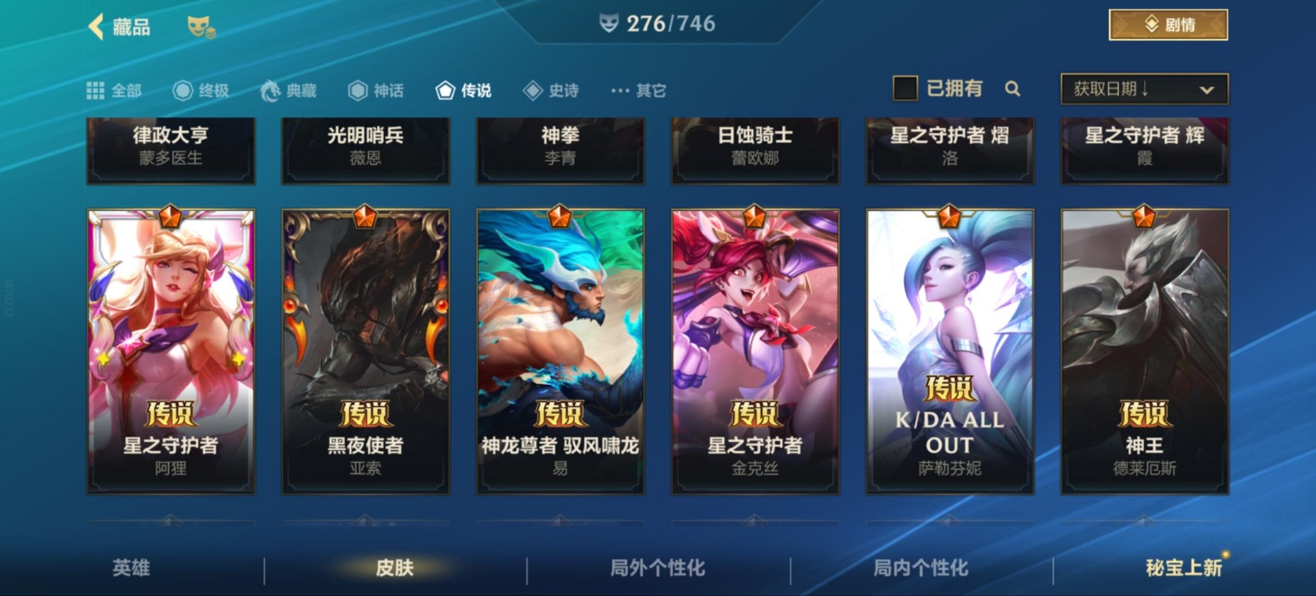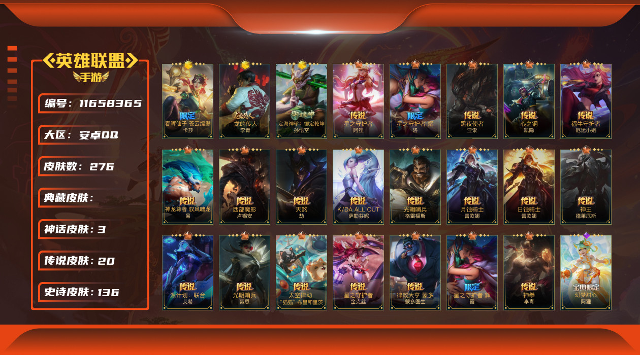 [11658365]20传说 136史诗 276皮肤 可二次 可修改实名 优质装备:福牛守护者女枪,光明哨兵薇恩,黑夜使者亚索,K/DA ALLOUT萨勒芬妮,律政大亨,日蚀骑士蕾欧娜,神龙尊者 驭风啸龙,神拳盲僧,神王诺手,天煞劫,西部魔影卢锡安,星之守护者金克丝,星之守护者阿狸,星之守护者 辉,星之守护者 熠,源计划:联合,月蚀骑士蕾欧娜,玉剑传说 武剑仙,光明哨兵格雷福斯,龙的传人,心之钢凯隐,春晖仙子苍云缥缈卡莎,定海神针:御定乾坤孙悟空,龙的传人 段位:翡翠 限定皮肤:斩星魔剑,水晶玫瑰皇子,定海神针:御定乾坤,水晶玫瑰琴女,山海绘卷狗熊 传说皮:太空律动机器人