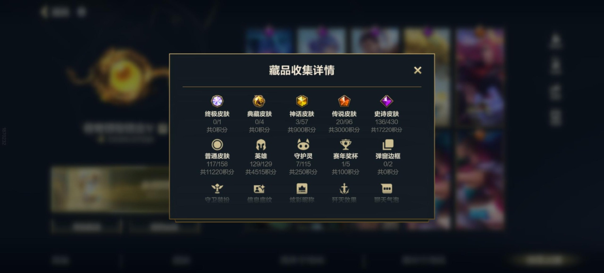 - PX_2099364-实名: 可修改 贵族等级: V6 英雄数: 122 皮肤数: 114 星传说: 幽冥火 传说皮: 地狱火 限定皮: 遇见飞天,李小龙,游园惊梦,至尊宝,愿照·九州拓