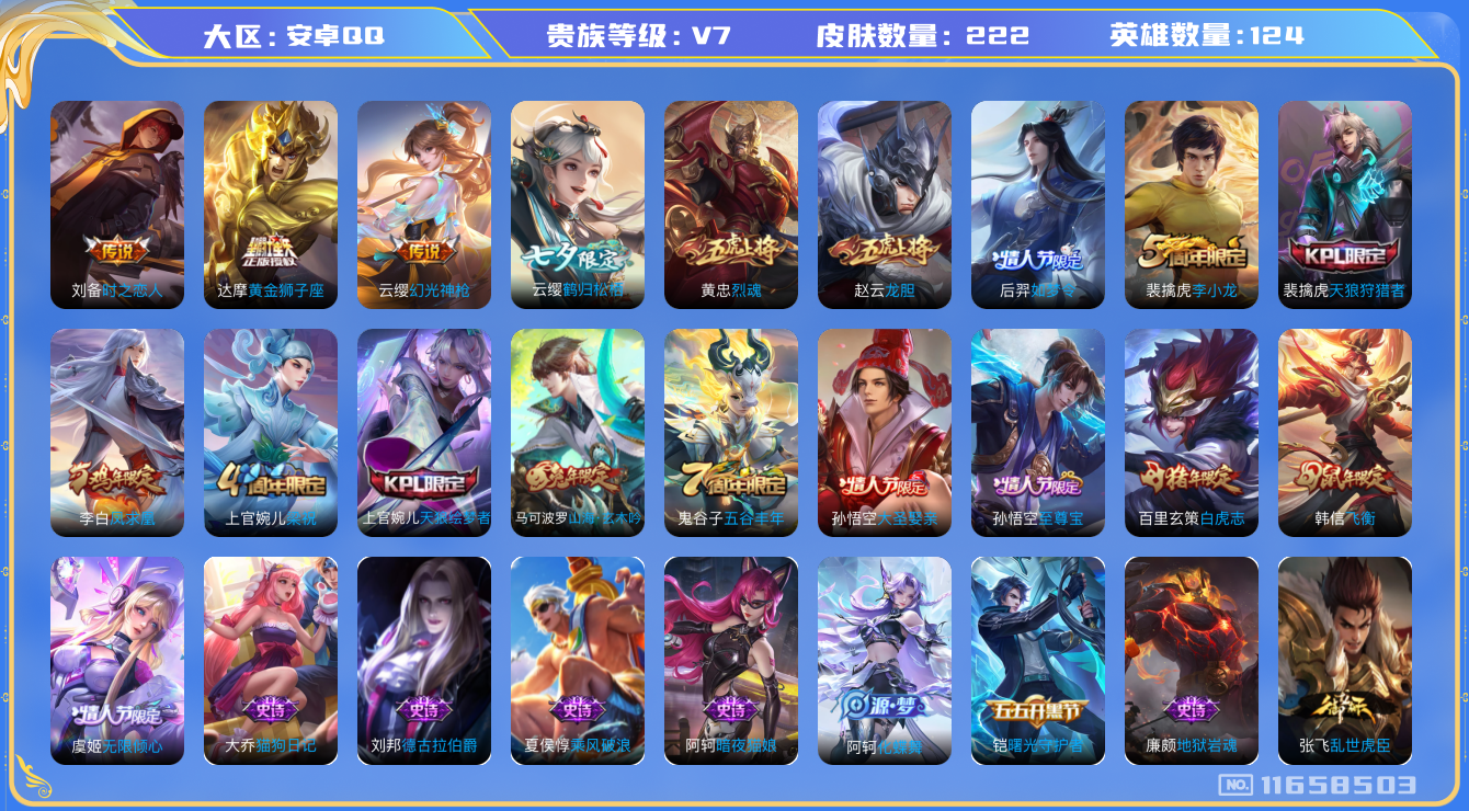 - [11796042]V7 6传说 124英雄 184皮肤 可修改实名 优质装备:冠军飞将,末日机甲-孙尚香(绿蚂蚱),超时空战士-狄仁杰 传说皮:乘龙·问璇玑(孙尚香年限) 珍宝阁皮:蔷薇恋人,女武神 限定皮:高山流水,诗剑行,五谷丰年,天狼运算者,梁祝,御风骁将(吕布年限),李小龙,如梦令-后羿,猪悟能,大圣娶亲,引擎之心,冰霜恋舞曲,深海之息(深海大菠萝),山海·玄木吟(马可年限) 史诗皮:龙之律动,琥珀纪元伽罗,电玩小子(小书包),特工魅影,千年之狐,永昼,江河有灵,魅语,百解令(蒙犽),蒙恬荣光圣徽,无限星赏官,冰冠公主,电玩·爆裂旋风,暗夜猫娘,女仆咖啡,水果甜心,天才门将,星夜王子,功夫厨神,德古拉伯爵,舞动绿茵,纤云弄巧,缤纷独角兽,逐浪之夏,水晶猎龙者,箭羽风息,圣诞恋歌,鹰眼统帅,魅力维加斯,黎明之约,无心