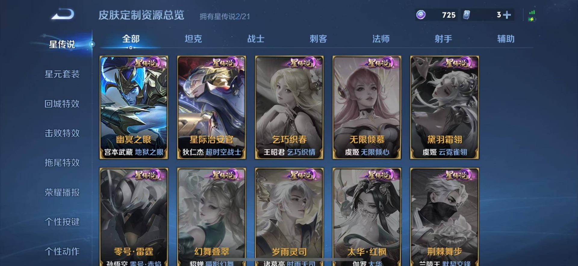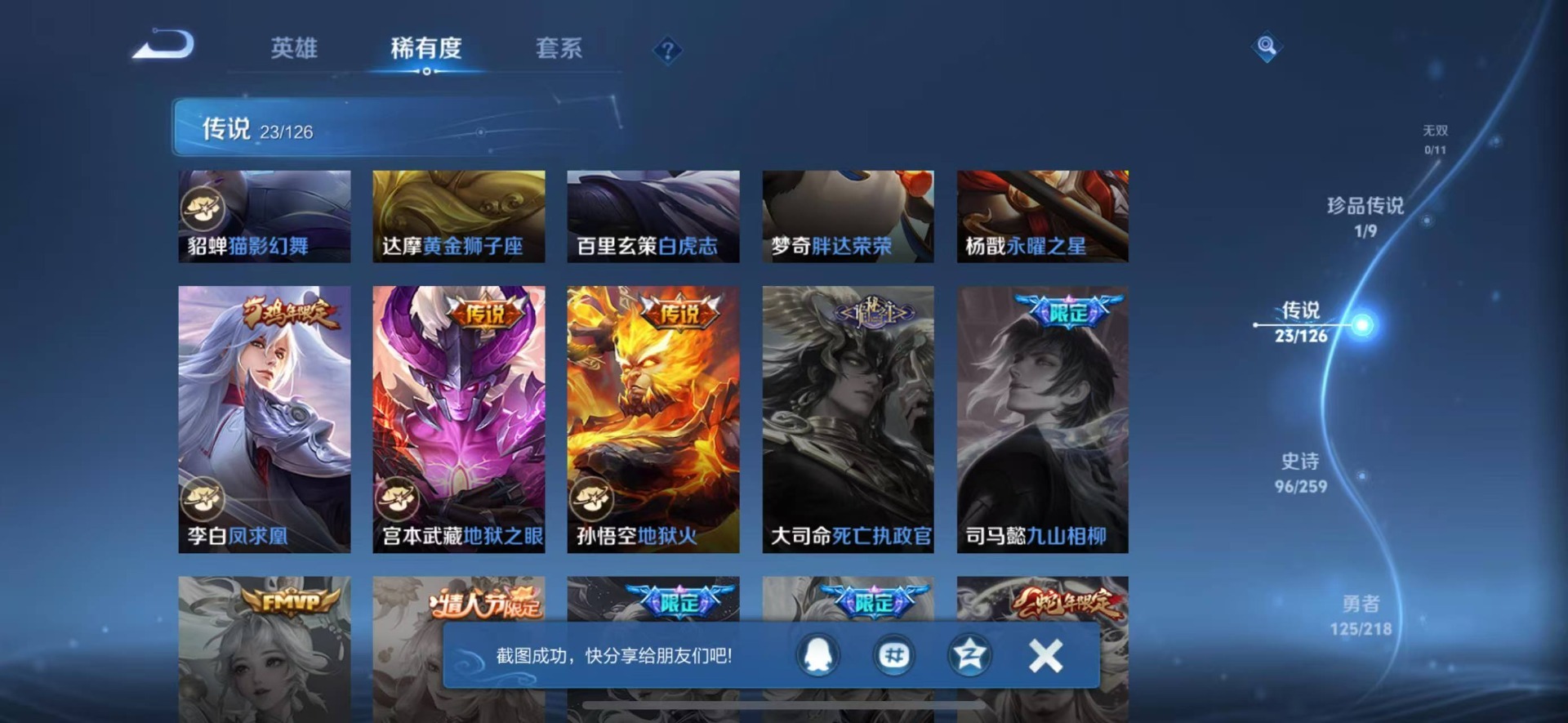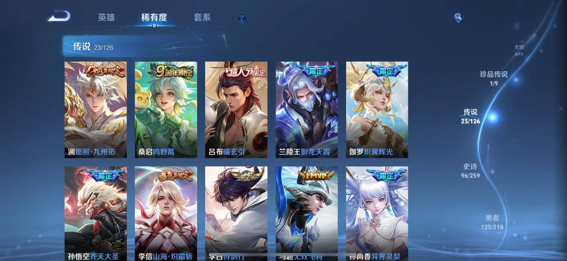 黄忠烈魂,铠青龙志,张飞虎魄,赵云龙胆,小乔纯白花嫁,孙尚香异界灵契,后羿如梦令,后羿辉光之辰,周瑜真爱至上,诸葛亮时雨天司,兰陵王影龙天霄,裴擒虎李小龙,上官婉儿梁祝,上官婉儿天狼绘梦者,李白诗剑行,马可波罗山海·玄木吟,桑启鸣野蒿,猪八戒猪悟能,孙悟空大圣娶亲,孙悟空至尊宝,百里玄策白虎志,马超神威,盘古冰霜神祇,百里守约朱雀志,澜愿照·九州拓,嫦娥如梦令,关羽冰锋战神