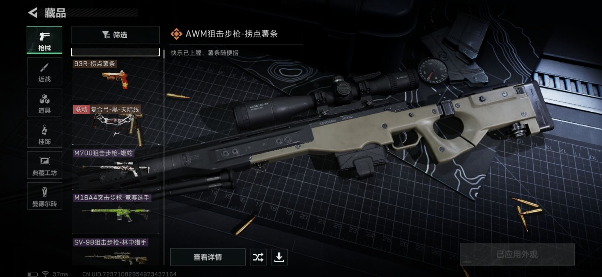 - PX_2101576-??/枪械14/装备262/载具2/战备152/王牌印记15/热力值81746/六级AKM-炫紫旋律/三级AKM-幽焰骑士/三级M416-墨龙九天/五级GROZA-镜光银凌/五级UMP45-量子极限/三级Vector-最终圣卫者/二级AKS-74U-星穹咏叹调/四级P90-金丰海韵/五级Kar98K-巳巳如意/三级M24-镜域双华/五级Mk14-精灵梦叶罗丽/七级SPAS-1