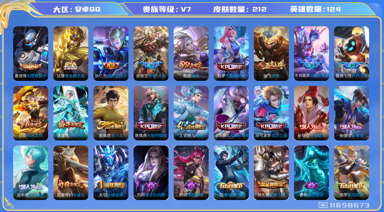 [11658673]V7 1典藏 4传说 124英雄 212皮肤 可修改实名 优质装备:无限飓风号(高达),黄金狮子座,零号·赤焰,超时空战士-狄仁杰 珍宝阁皮:优雅恋人 限定皮:至尊宝,时雨天司(水龙头),冰锋战神,幽恒(沐浴露),梁祝,天狼狩猎者,逐梦之星,天狼溯光者,虎魄,天狼绘梦者,李小龙,朱雀志(守约年限),辉光之辰,大圣娶亲,冰霜恋舞曲,乒乒小将,时之祈愿-云中君 史诗皮:苍穹之光,黄金分割率,百解令(蒙犽),偶像歌手,暗夜猫娘,魅语,猫狗日记-孙策,时之恋人-孙尚香,乱世虎臣,女仆咖啡,水果甜心,天才门将,星夜王子,功夫厨神,德古拉伯爵,幽灵船长,舞动绿茵,纤云弄巧,繁星吟游(呼啦呼啦),逐浪之夏,曙光守护者,箭羽风息,金属风暴,圣诞狂欢,圣诞恋歌,鹰眼统帅,王者之锤,魅力维加斯,未来纪元-赵云