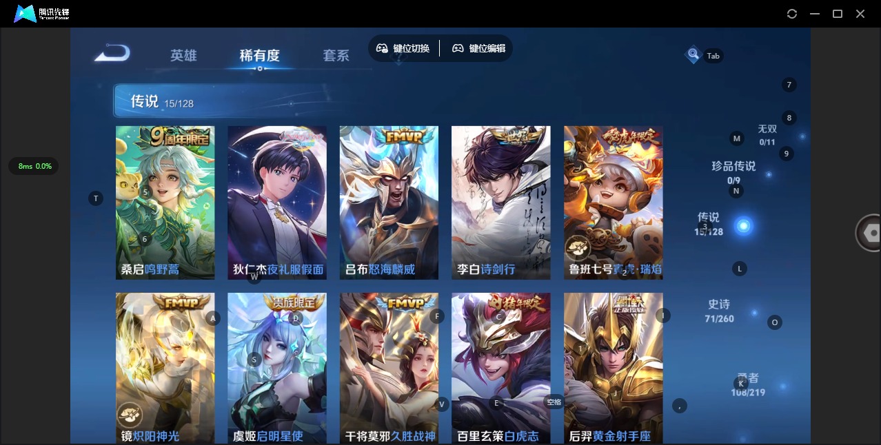 - [11498184]V7 10传说 123英雄 197皮肤 可修改实名 传说皮:幻光神枪,游龙清影(小青龙),黄金狮子座,久胜战神,云鹰飞将(小将军),时之恋人-刘备(电焊工),超时空战士-狄仁杰 珍宝阁皮:万物之道,蔷薇恋人 限定皮:愿照·山河定(司空震年限),鸣野蒿,至尊宝,神威(电光马子),飞衡(韩信年限),诗剑行,李小龙 史诗皮:茶境仙,器灵·浮梦炉,龙之律动,百相守梦-黄忠,紫霞仙子,白龙吟,黄金分割率,特工魅影,千年之狐,偶像歌手,晚萤,末日机甲-吕布,时之恋人-孙尚香,乱世虎臣,节奏热浪,修罗,摇滚巨星,星夜王子,暗隐猎兽者,幽灵船长,鬼剑武藏,纤云弄巧,繁星吟游(呼啦呼啦),拒霜思,逐浪之夏,水晶猎龙者,曙光守护者,热力回旋,金属风暴,原初追逐者,鹰眼统帅,黎明之约