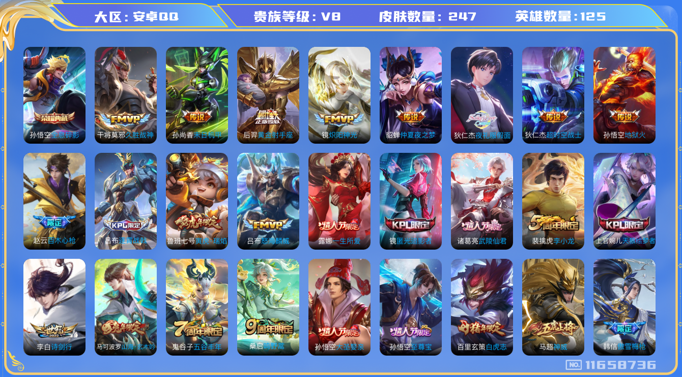 [11658736]V8 1典藏 15传说 125英雄 247皮肤 可修改实名 优质装备:全息碎影(猴子典藏),黄金射手座,久胜战神,炽阳神光,末日机甲-孙尚香(绿蚂蚱),地狱火,仲夏夜之梦(大飞蛾),超时空战士-狄仁杰,夜礼服假面 珍宝阁皮:优雅恋人,女武神 限定皮:逐霄战戟,鸣野蒿,至尊宝,白虎志(电光耗子),武陵仙君(小桃花),傲雪梅枪,神威(电光马子),诗剑行,怒海麟威,五谷丰年,天狼绘梦者,李小龙,朱雀志(守约年限),一生所爱,大圣娶亲,匿光追影者,寅虎·瑞焰(虎皮蛋子),百木心枪,山海·玄木吟(马可年限) 史诗皮:星界战将,龙之律动,紫霞仙子,黄金分割率,千年之狐,永昼,江河有灵,雪夜绮愿(周瑜),百解令(蒙犽),蒙恬荣光圣徽,无限星赏官,冰冠公主,偶像歌手,晚萤,末日机甲-吕布,猫狗日记-孙策,猫狗日记-大乔,乱世虎臣,节奏热浪,修罗,女仆咖啡,摇滚巨星,水果甜心,天才门将,星夜王子,功夫厨神,德古拉伯爵,暗隐猎兽者,幽灵船长,鬼剑武藏,暗渊魔法,心灵战警,地狱岩魂,繁星吟游(呼啦呼啦),拒霜思,缤纷独角兽,乘风破浪,逐浪之夏,水晶猎龙者,曙光守护者,箭羽风息,金属风暴,原初追逐者,圣诞狂欢,鹰眼统帅,魅力维加斯,黎明之约,赏金猎手,无心,未来纪元-赵云