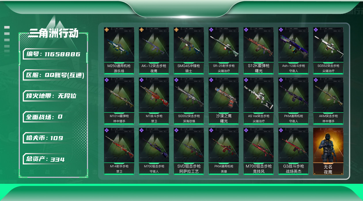 [11658886]可二次 可修改实名 顶级安全箱(3×3)7.1号到期 实名:可修改 烽火地带段位:无段位 全面战场段位:无段位 总资产(M):334.2 哈夫币:109 传说武器皮肤:SMG45冲锋枪-骑士,AK-12突击步枪-夜鹰,M250通用机枪-游乐场 史诗武器皮肤:G3战斗步枪-战场英杰,SR-25射手步枪-尖端治疗,M1014霰弹枪-林中猎手,PKM通用机枪-守夜人,AS Val突击步枪-尖端治疗,M700狙击步枪-守夜人,SG552突击步枪-尖端治疗,Ash-12战斗步枪-守夜人,PKM通用机枪-英雄,SG552突击步枪-深海恐惧,AKM突击步枪-林中猎手,M14射手步枪-禁卫,M7战斗步枪-禁卫,SVD狙击步枪-阿萨拉工艺,M700狙击步枪-竞技风,沙漠之鹰-曙光,S12K霰弹枪-曙光 干员外观:无名-夜鹰