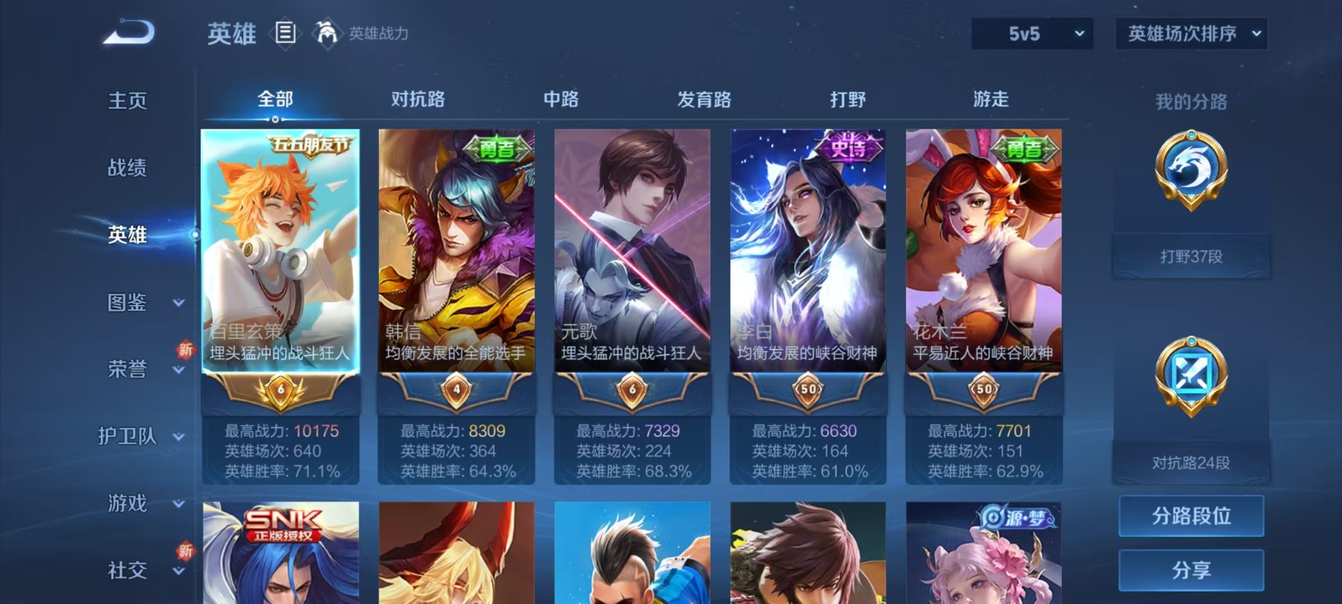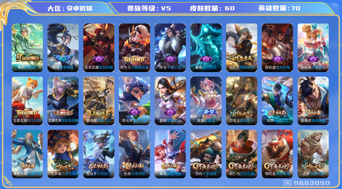 [11663090]V5 1传说 70英雄 60皮肤 可修改实名 限定皮:鸣野蒿,傲雪梅枪 史诗皮:紫霞仙子,千年之狐,水果甜心,功夫厨神,幽灵船长,鬼剑武藏,拒霜思,逐浪之夏,水晶猎龙者,热力回旋,原初追逐者,鹰眼统帅,黎明之约