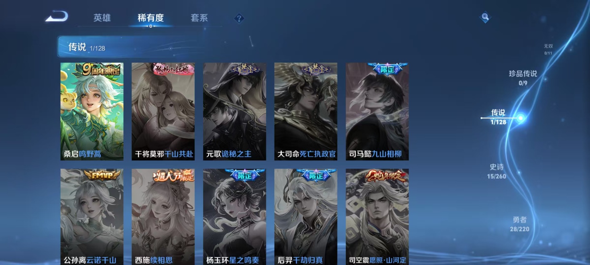 - [12260186]V9 3典藏 28传说 125英雄 273皮肤 典藏英雄武则天 可修改实名 优质装备:倪克斯神谕(宇宙婆娘),无限飓风号(高达),鸣剑·曳影,黄金狮子座,黄金射手座,云鹰飞将(小将军),绛天战甲(鸡嘴战神),猫影幻舞,久胜战神,炽阳神光,一念神魔,末日机甲-孙尚香(绿蚂蚱),仲夏夜之梦(大飞蛾),零号·赤焰,地狱之眼,乞巧织情,淬星耀世,超时空战士-狄仁杰,末日机甲-孙策,无双飞将,霜月吟 传说皮:幻光神枪 珍宝阁皮:优雅恋人,蔷薇恋人,女武神 限定皮:愿照·山河定(司空震年限),鸣野蒿,至尊宝,白虎志(电光耗子),凤求凰(白切鸡),凤凰于飞,武陵仙君(小桃花),神威(电光马子),飞衡(韩信年限),高山流水,齐天大圣,五谷丰年,青龙志(铠年限),冰锋战神,武圣,游园惊梦,梁祝,御风骁将(吕布年限),岱宗(典韦年限),天狼溯光者,天狼绘梦者,李小龙,逐梦之影,朱雀志(守约年限),如梦令-后羿,默契交锋-花木兰,一生所爱,天魔缭乱,山海·玄木吟(马可年限) 史诗皮:星界战将,百相守梦-百里守约,百相守梦-黄忠,紫霞仙子,苍穹之光,电玩小子(小书包),白龙吟,黄金分割率,特工魅影,千年之狐,江河有灵,魅语,高渐离燃音魔法,蒙恬荣光圣徽,无限星赏官,冰冠公主,偶像歌手,电玩·爆裂旋风,龙骑士(小龙虾),末日机甲-吕布,猫狗日记-孙策,猫狗日记-大乔,乱世虎臣,节奏热浪,修罗,女仆咖啡,水果甜心,天才门将,星夜王子,心灵骇客,功夫厨神,德古拉伯爵,暗隐猎兽者,幽灵船长,鬼剑武藏,心灵战警,舞动绿茵,地狱岩魂,拒霜思,缤纷独角兽,乘风破浪,逐浪之夏,水晶猎龙者,曙光守护者,热力回旋,箭羽风息,金属风暴,原初追逐者,圣诞狂欢,圣诞恋歌,鹰眼统帅,魅力维加斯,黎明之约,赏金猎手,无心,未来纪元-赵云