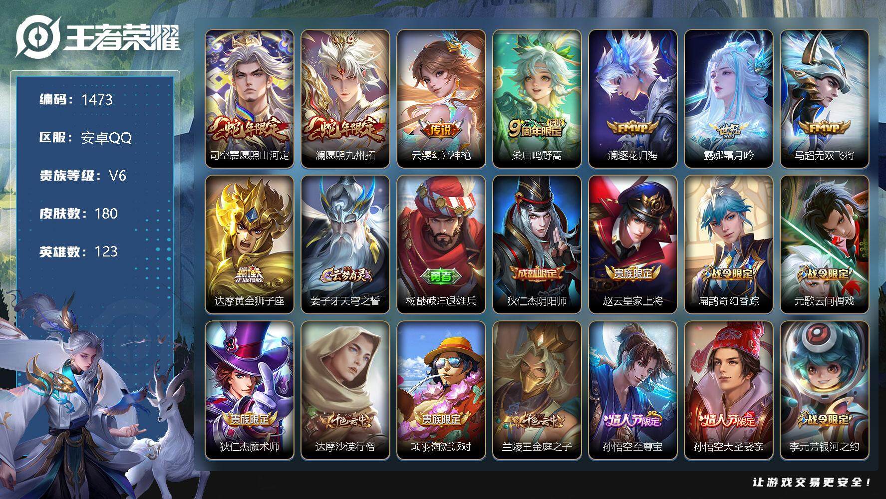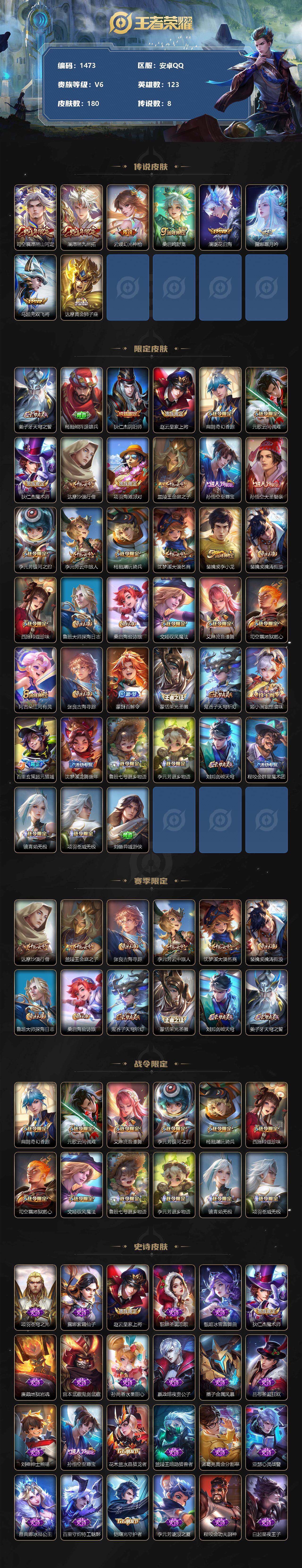 [11664391]【商品标题】:安卓Q-V6-最强王者段位-123英雄-180皮肤-0典藏-0珍品无双-0无双-0珍品传说-8传说-52史诗