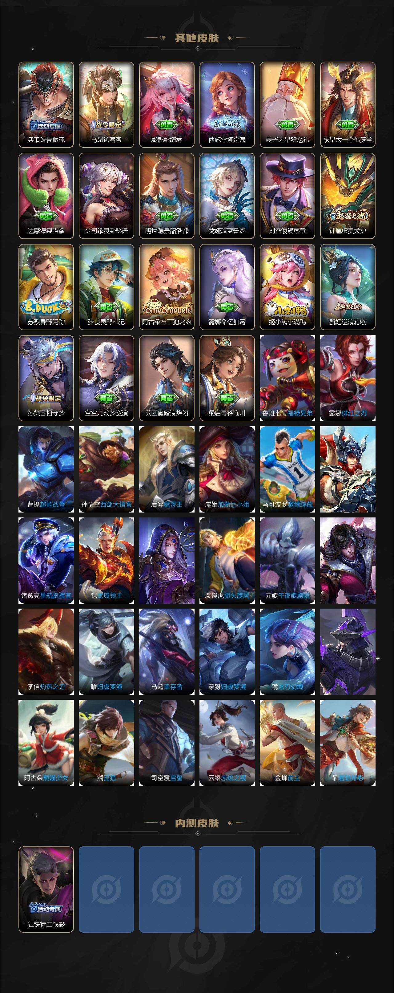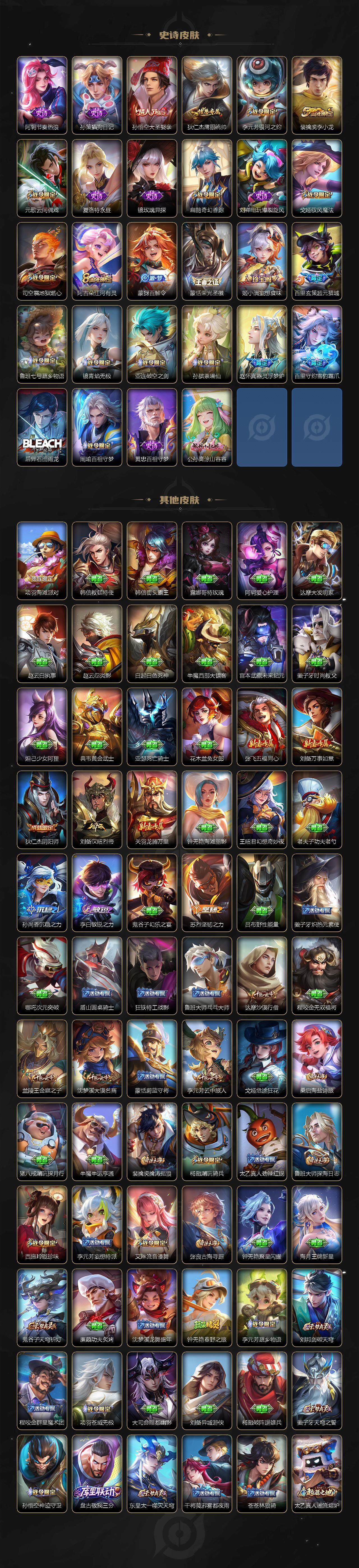 【史诗皮肤】:项羽苍穹之光,露娜紫霞仙子,赵云皇家上将,貂蝉圣诞恋歌,甄姬冰雪圆舞曲,狄仁杰魔术师,廉颇地狱岩魂,宫本武藏鬼剑武藏,孙尚香水果甜心,嬴政暗夜贵公子,墨子金属风暴,吕布圣诞狂欢,刘禅绅士熊喵,孙悟空至尊宝,花木兰水晶猎龙者,兰陵王暗隐猎兽者,诸葛亮黄金分割率,亚瑟心灵战警,雅典娜冰冠公主,百里守约特工魅影,铠曙光守护者,李元芳逐浪之夏,程咬金功夫厨神,白起星夜王子,阿轲节奏热浪,孙策猫狗日记,孙悟空大圣娶亲,狄仁杰鹰眼统帅,李元芳银河之约,裴擒虎李小龙,元歌云间偶戏,夏洛特永昼,镜玫瑰异探,扁鹊奇幻香踪,刘禅电玩爆裂旋风,戈娅驭风魔法,司空震地狱燃心,阿古朵江河有灵,蒙犽百解令,蒙恬荣光圣徽,姬小满妄想食味,百里玄策超元猎域,鲁班七号蔬乡物语,镜青焰无极,亚连破空之剑,孙膑茶境仙,赵怀真器灵浮梦炉,百里守约雪豹霜爪,后羿石田雨龙,周瑜百