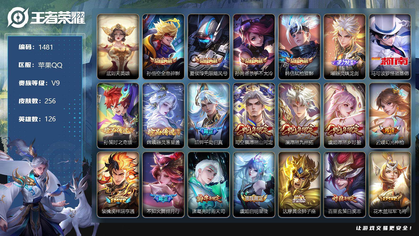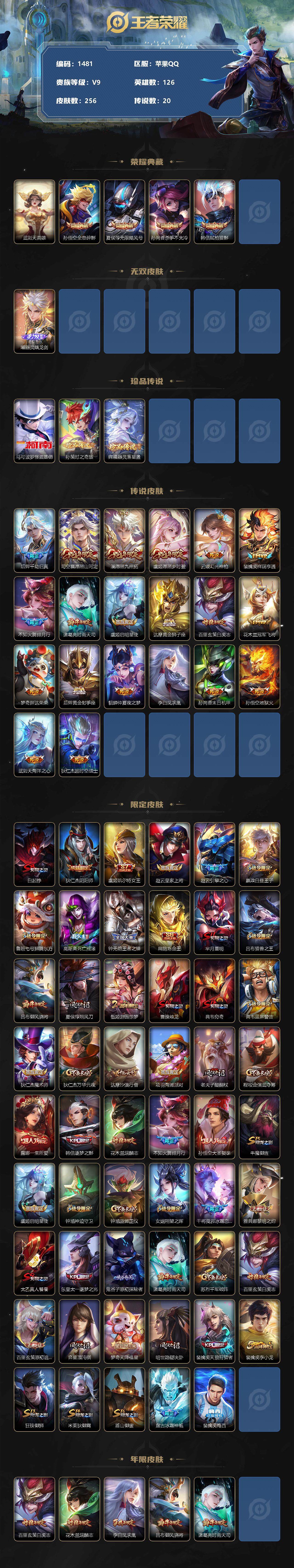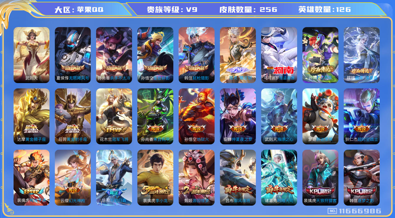 [11666986]【商品标题】:苹果Q-V9-最强王者段位-126英雄-256皮肤-4典藏-0珍品无双-1无双-3珍品传说-20传说-70史诗