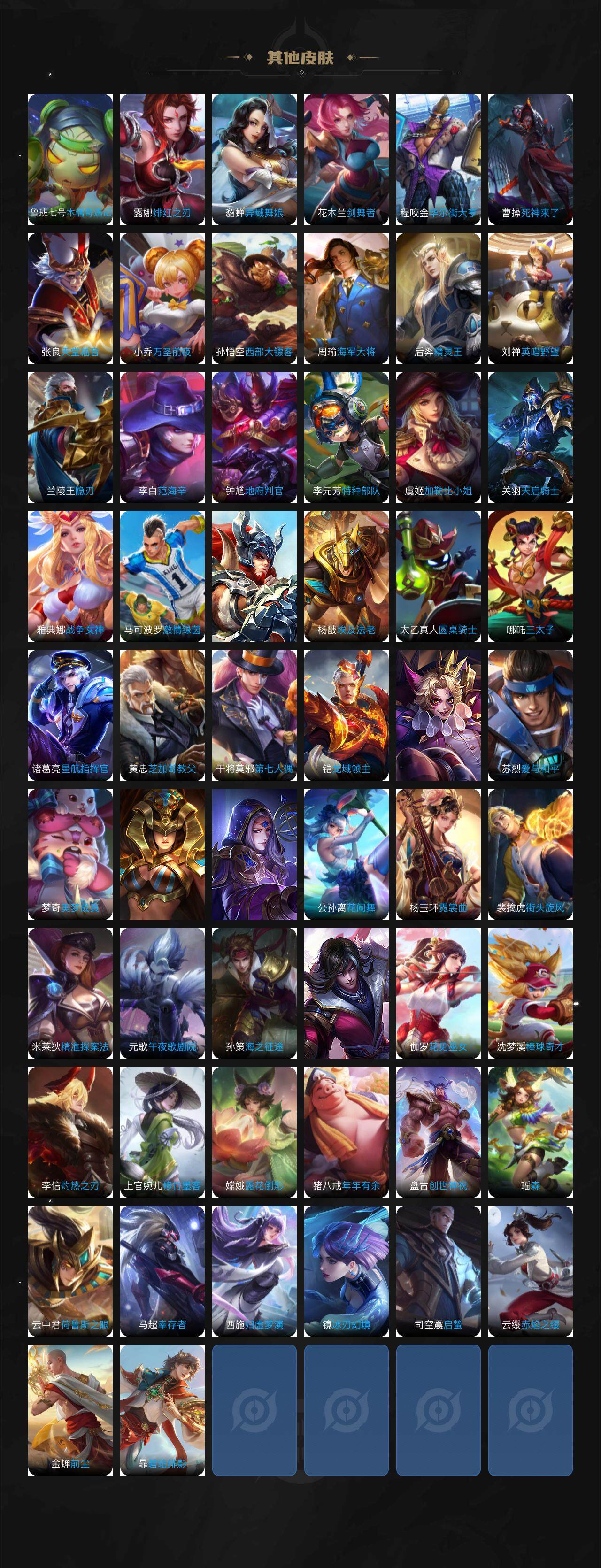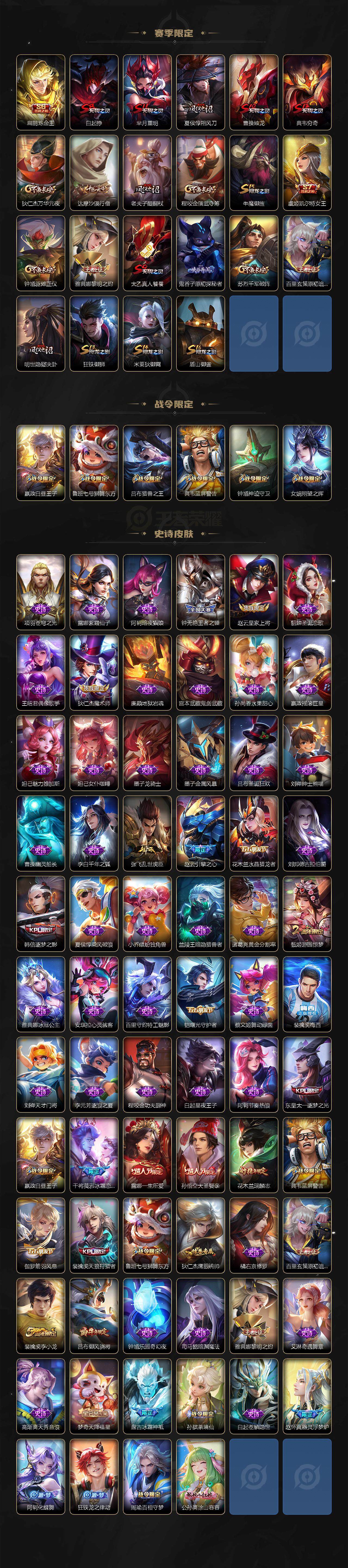 【限定皮肤】:白起狰,狄仁杰阴阳师,虞姬凯尔特女王,赵云皇家上将,赵云引擎之心,嬴政白昼王子,鲁班七号狮舞东方,高渐离死亡摇滚,钟无艳王者之锤,扁鹊炼金王,芈月重明,吕布猎兽之王,吕布御风骁将,夏侯惇朔风刀,甄姬游园惊梦,曹操烛龙,典韦穷奇,典韦蓝屏警告,狄仁杰魔术师,狄仁杰万华元夜,达摩沙漠行僧,项羽海滩派对,老夫子醍醐杖,程咬金演武夺筹,露娜一生所爱,韩信逐梦之影,花木兰瑞麟志,不知火舞绯月行,孙悟空大圣娶亲,牛魔御旌,虞姬启明星使,钟馗神迹守卫,钟馗驱傩正仪,女娲朔望之晖,干将莫邪冰霜恋舞曲,雅典娜黎明之约,太乙真人饕餮,东皇太一逐梦之光,鬼谷子原初探秘者,诸葛亮时雨天司,苏烈千军破阵,百里玄策白虎志,百里玄策原初追逐者,弈星混沌棋,梦奇天降福星,明世隐疑决卦,裴擒虎天狼狩猎者,裴擒虎李小龙,狂铁御狮,米莱狄御霄,盾山御銮,盘古冰霜神祇,裴擒虎梅西