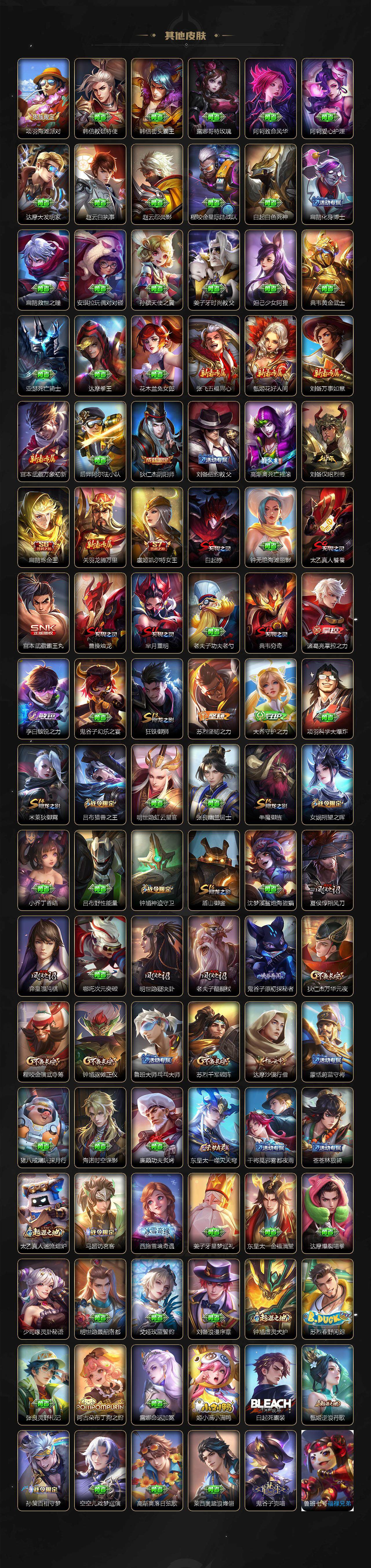 伽罗箭羽风息,李元芳逐浪之夏,阿轲节奏热浪,露娜紫霞仙子,诸葛亮黄金分割率,王昭君偶像歌手,项羽苍穹之光,阿轲暗夜猫娘,雅典娜冰冠公主,橘右京修罗,墨子龙骑士,嬴政摇滚巨星,刘禅绅士熊喵,刘禅天才门将,白起星夜王子,安琪拉心灵骇客,程咬金功夫厨神,刘邦德古拉伯爵,兰陵王暗隐猎兽者,曹操幽灵船长,宫本武藏鬼剑武藏,司马懿暗渊魔法,钟馗乐园奇幻夜,蔡文姬舞动绿茵,廉颇地狱岩魂,小乔缤纷独角兽,夏侯惇乘风破浪,花木兰水晶猎龙者,铠曙光守护者,墨子金属风暴,百里玄策原初追逐者,吕布圣诞狂欢,貂蝉圣诞恋歌,百里守约特工魅影,雅典娜黎明之约,李白千年之狐,艾琳奇遇舞章,高渐离天秀·音浪,白起苍鳞隐世,赵怀真器灵·浮梦炉