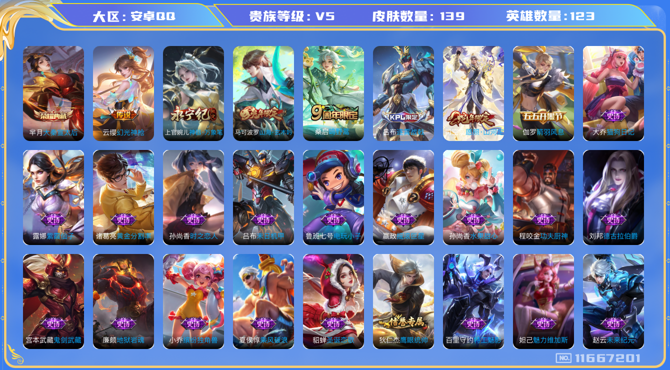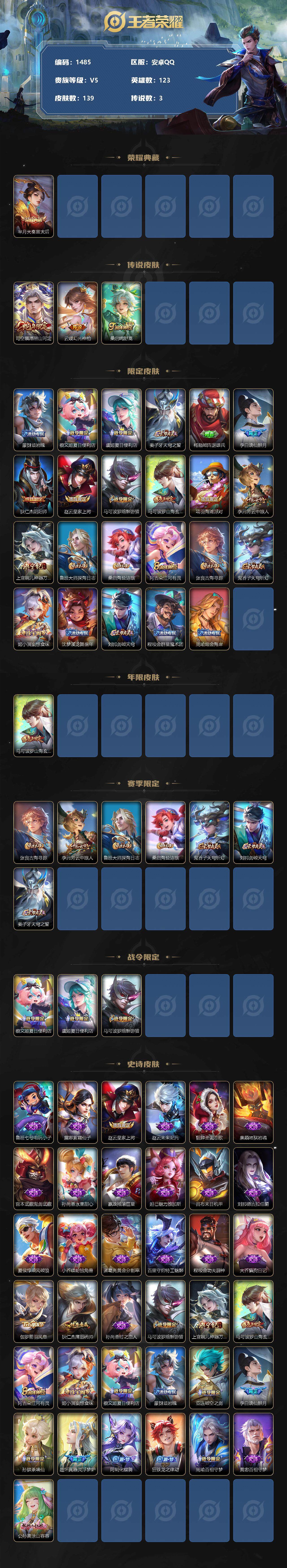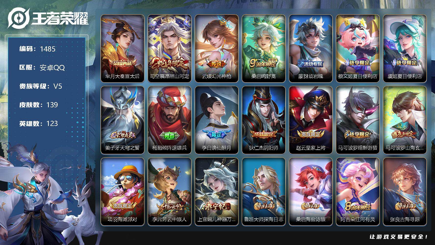 [11667201]【商品标题】:安卓Q-V5-至尊星耀V段位-123英雄-139皮肤-1典藏-0珍品无双-0无双-0珍品传说-3传说-37史诗
