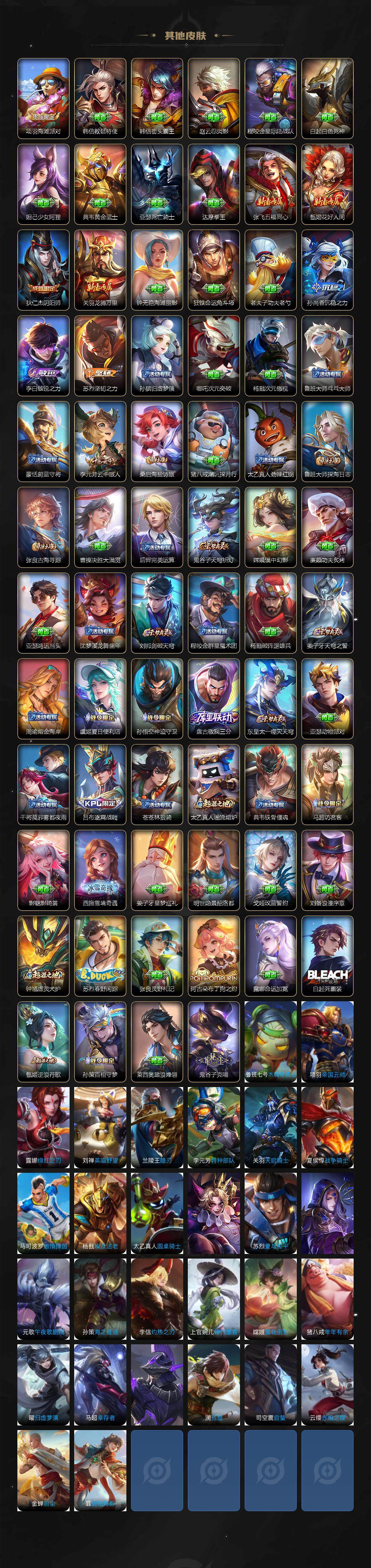 【其他皮肤】:项羽海滩派对,韩信教廷特使,韩信街头霸王,赵云忍炎影,程咬金星际陆战队,白起白色死神,妲己少女阿狸,典韦黄金武士,亚瑟死亡骑士,达摩拳王,张飞五福同心,甄姬花好人间,狄仁杰阴阳师,关羽龙腾万里,钟无艳海滩丽影,狂铁命运角斗场,老夫子功夫老勺,孙尚香沉稳之力,李白敏锐之力,苏烈坚韧之力,孙膑归虚梦演,哪吒次元突破,杨戬次元傲视,鲁班大师乓乓大师,蒙恬蔚蓝守将,李元芳云中旅人,桑启海盐诗旅,猪八戒潮玩探月行,太乙真人劲辣红锅,鲁班大师探海日志,张良古海寻踪,曹操决胜大满贯,后羿完美运算,鬼谷子天穹祈灯,嫦娥漠中幻影,廉颇功夫炙烤,亚瑟鸿运当头,沈梦溪龙舞盛年,刘邦剑破天穹,程咬金