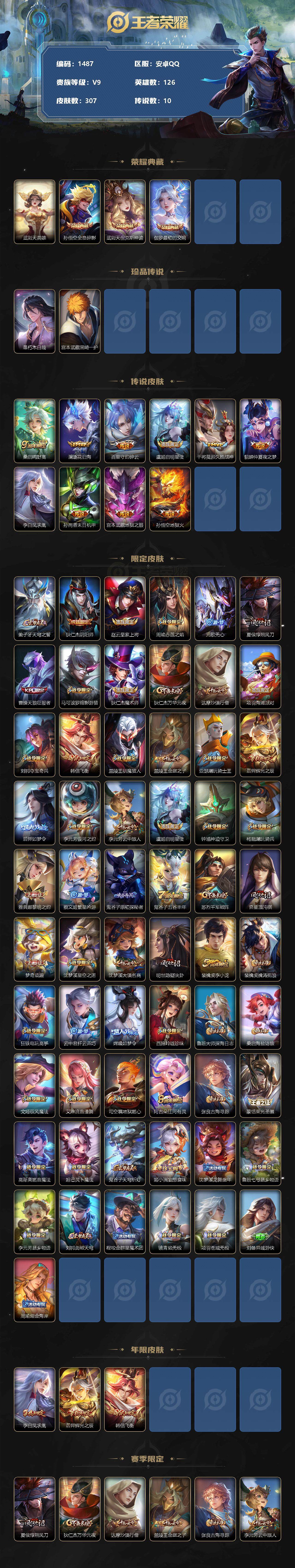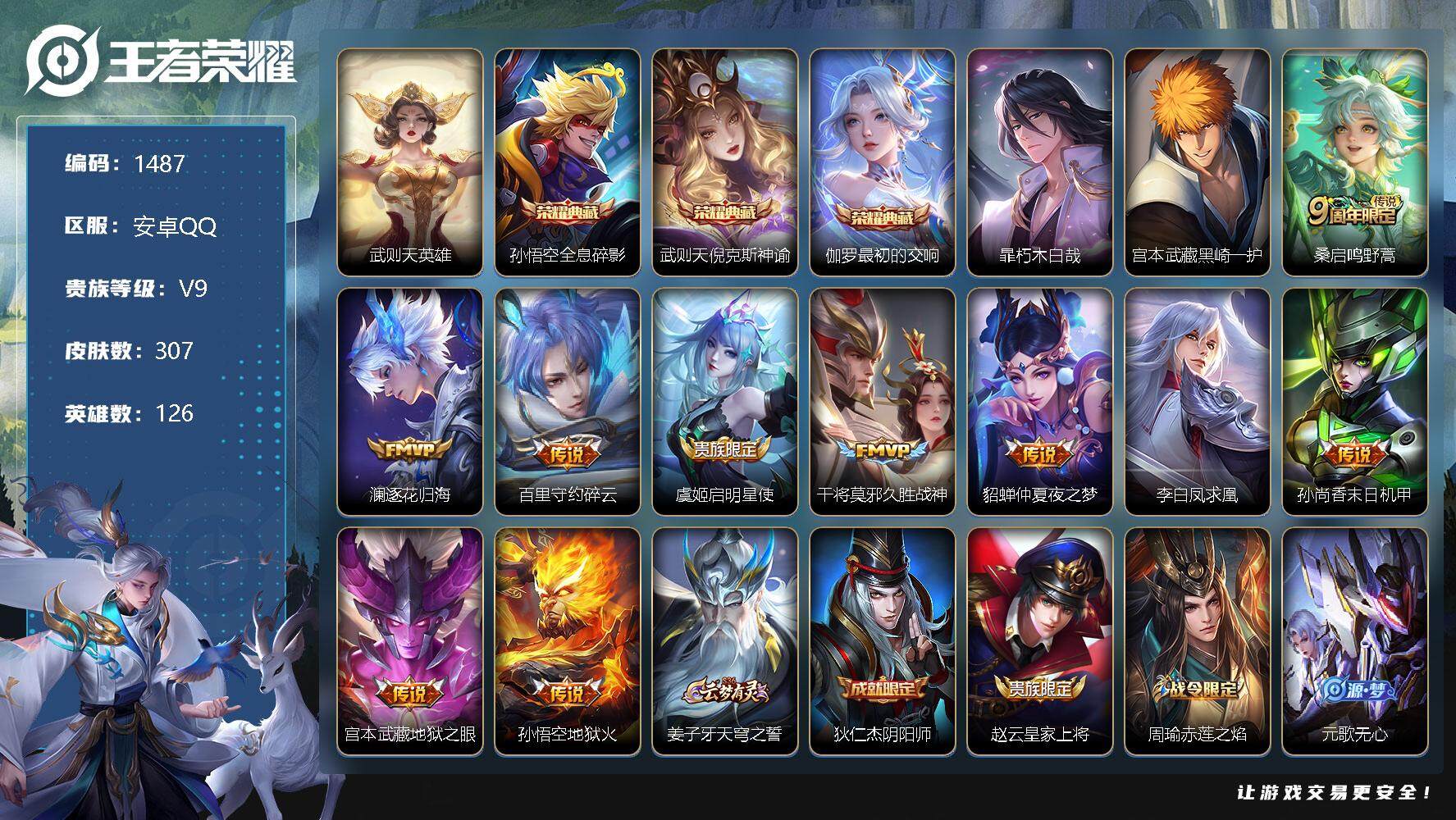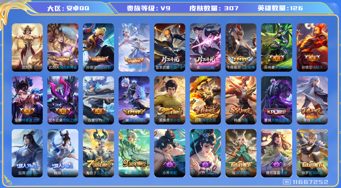 [11667252]【商品标题】:安卓Q-V9-最强王者段位-126英雄-307皮肤-3典藏-0珍品无双-0无双-2珍品传说-10传说-86史诗