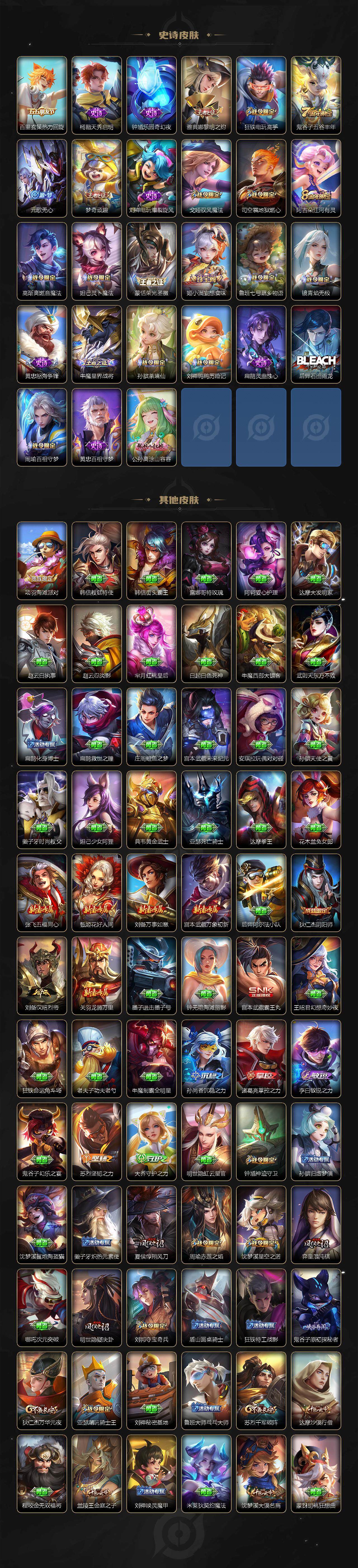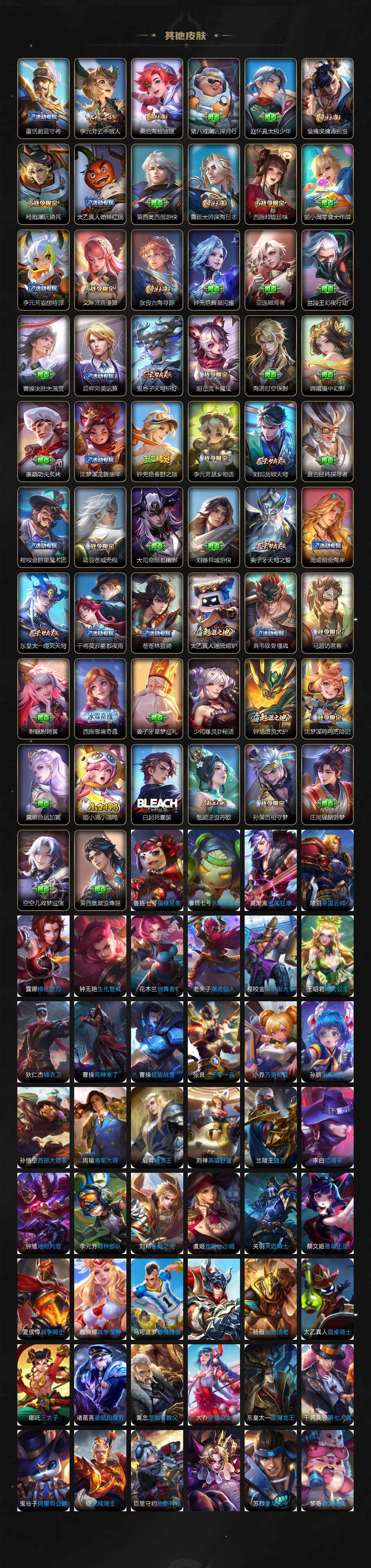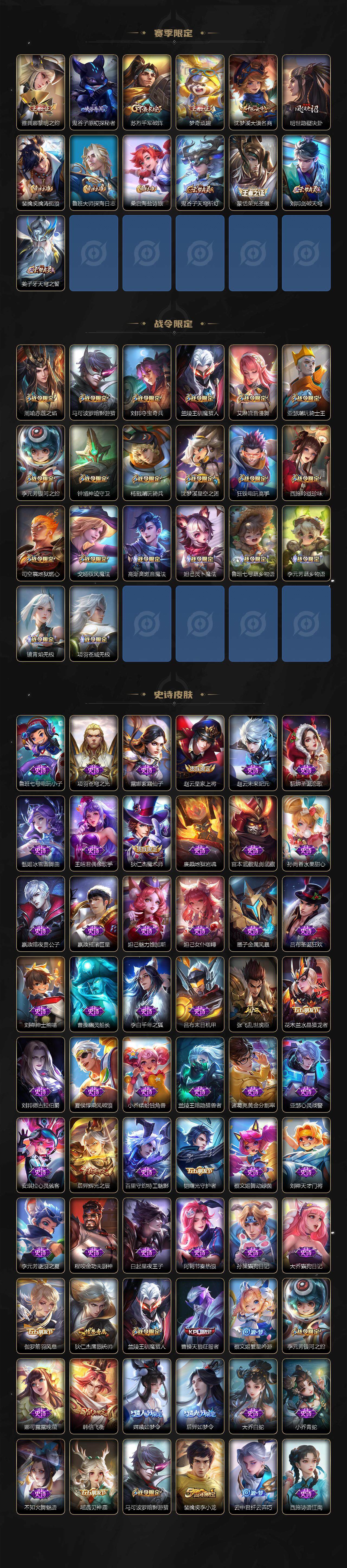 【限定皮肤】:姜子牙天穹之誓,狄仁杰阴阳师,赵云皇家上将,周瑜赤莲之焰,元歌无心,夏侯惇朔风刀,曹操天狼征服者,马可波罗暗影游猎,狄仁杰魔术师,狄仁杰万华元夜,达摩沙漠行僧,项羽海滩派对,刘邦夺宝奇兵,韩信飞衡,兰陵王驯魔猎人,兰陵王金庭之子,亚瑟潮玩骑士王,后羿辉光之辰,后羿如梦令,李元芳银河之约,李元芳云中旅人,虞姬启明星使,钟馗神迹守卫,杨戬潮玩骑兵,雅典娜黎明之约,蔡文姬繁星吟游,鬼谷子原初探秘者,鬼谷子五谷丰年,苏烈千军破阵,弈星混沌棋,梦奇顽趣,沈梦溪星空之诺,沈梦溪大漠名商,明世隐疑决卦,裴擒虎李小龙,裴擒虎擒涛扼浪,狂铁电玩高手,云中君纤云弄巧,嫦娥如梦令,西施玲珑珍味,鲁班大师探海日志,桑启海盐诗旅,戈娅驭风魔法,艾琳流音漫舞,司空震地狱燃心,阿古朵江河有灵,张良古海寻踪,蒙恬荣光圣徽,高渐离燃音魔法,妲己灵卜魔法,鬼谷子天穹祈灯,姬小满妄想食味,沈梦溪龙舞盛年,鲁班七号蔬乡物语,李元芳蔬乡物语,刘邦剑破天穹,程咬金群星魔术团,镜青焰无极,项羽苍威无极,刘备异域游侠,周瑜熔金海岸