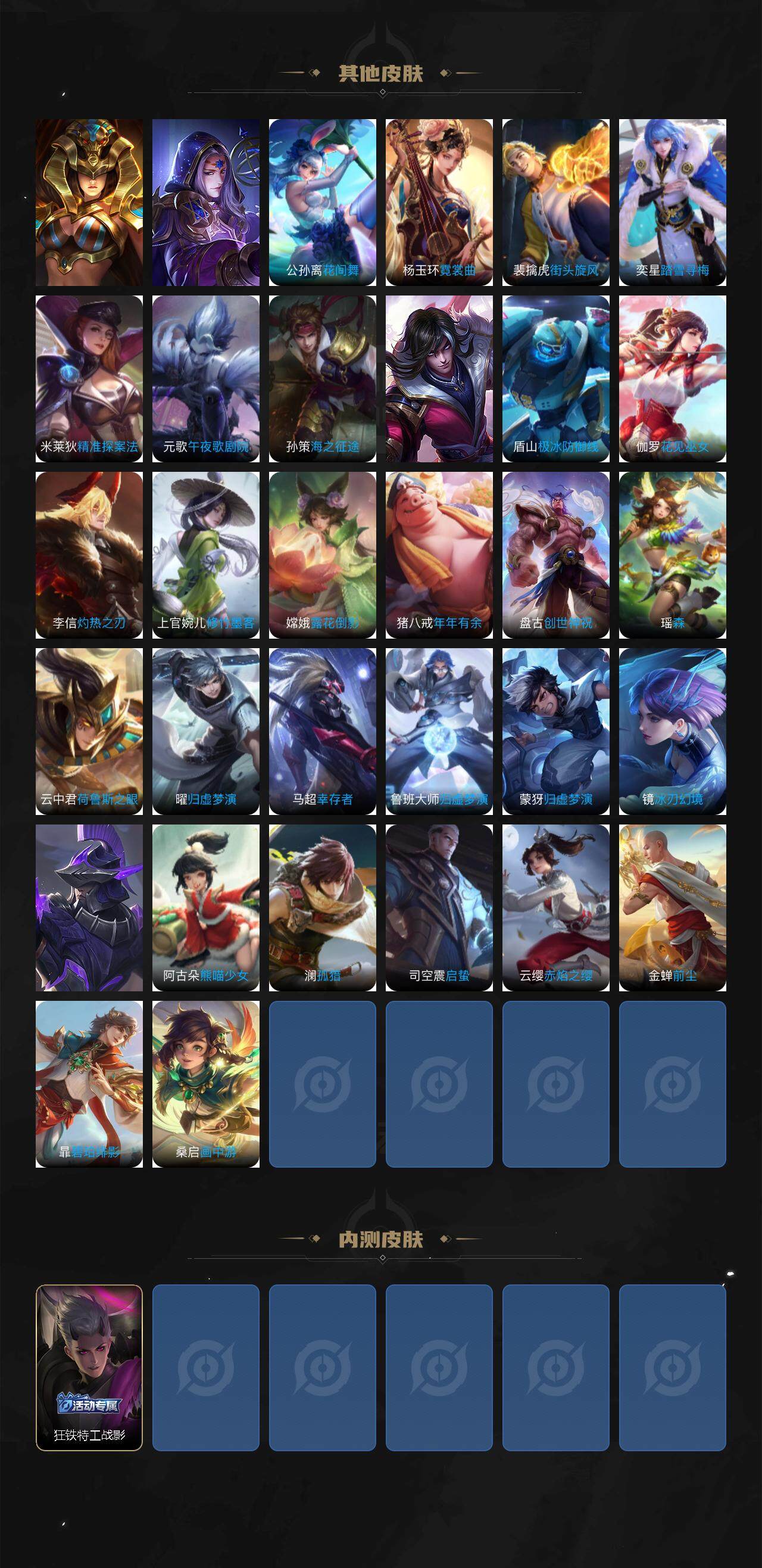 【赛季限定】:夏侯惇朔风刀,狄仁杰万华元夜,达摩沙漠行僧,兰陵王金庭之子,张良古海寻踪,李元芳云中旅人,雅典娜黎明之约,鬼谷子原初探秘者,苏烈千军破阵,弈星混沌棋,梦奇顽趣,沈梦溪大漠名商,明世隐疑决卦,裴擒虎擒涛扼浪,鲁班大师探海日志,桑启海盐诗旅,鬼谷子天穹祈灯,蒙恬荣光圣徽,刘邦剑破天穹,姜子牙天穹之誓