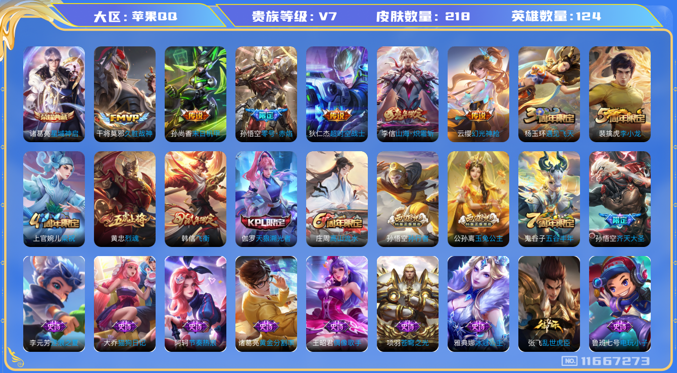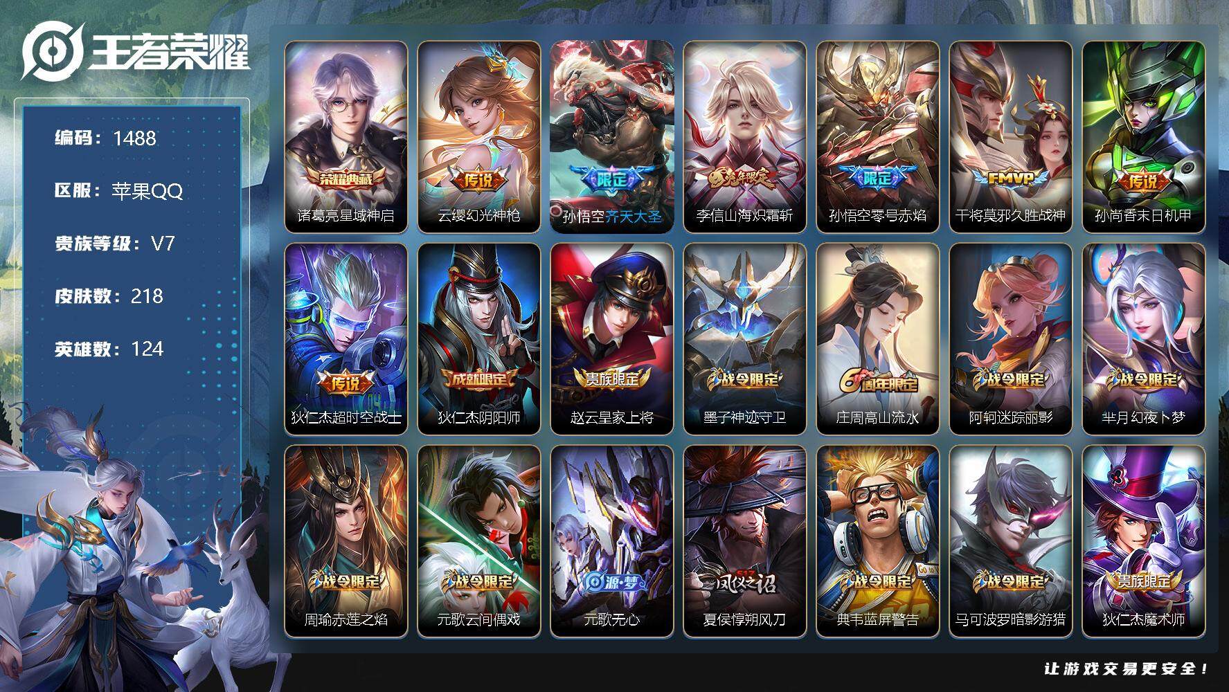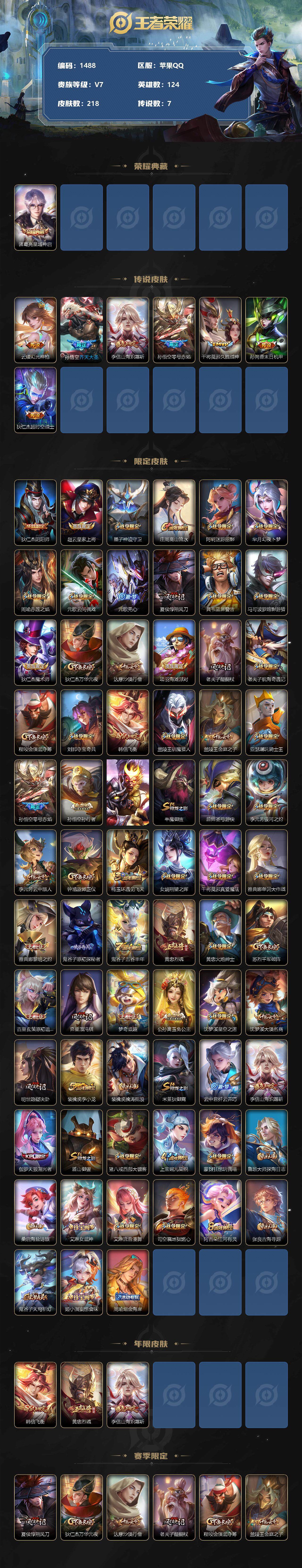 [11667273]【商品标题】:苹果Q-V7-最强王者段位-124英雄-218皮肤-1典藏-0珍品无双-0无双-0珍品传说-7传说-63史诗