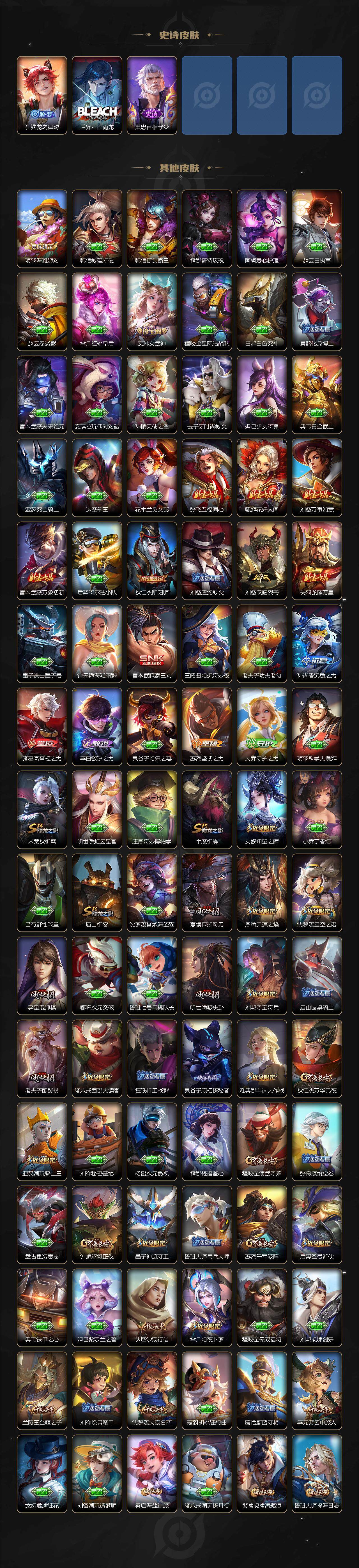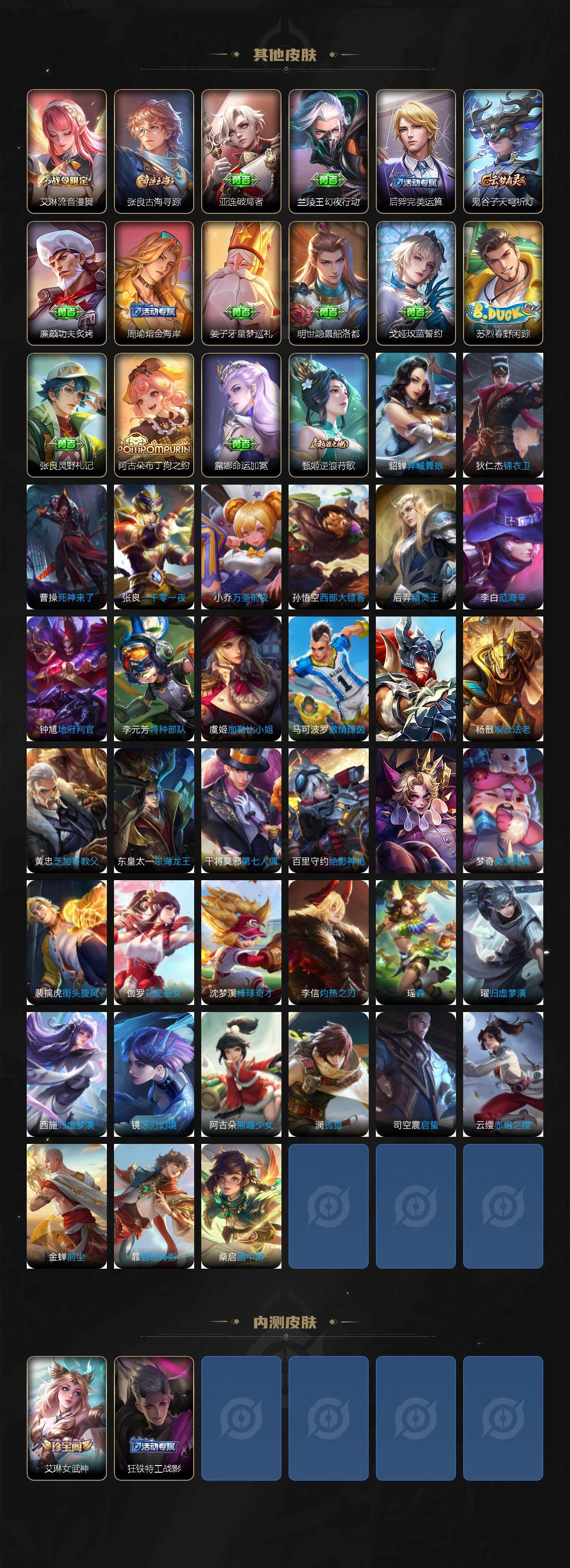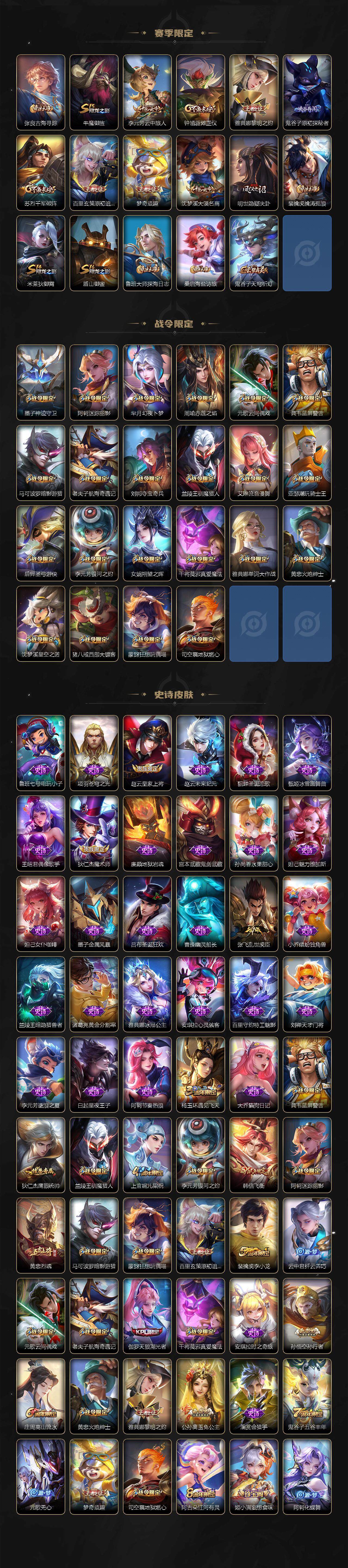 【限定皮肤】:狄仁杰阴阳师,赵云皇家上将,墨子神迹守卫,庄周高山流水,阿轲迷踪丽影,芈月幻夜卜梦,周瑜赤莲之焰,元歌云间偶戏,元歌无心,夏侯惇朔风刀,典韦蓝屏警告,马可波罗暗影游猎,狄仁杰魔术师,狄仁杰万华元夜,达摩沙漠行僧,项羽海滩派对,老夫子醍醐杖,老夫子航海奇遇记,程咬金演武夺筹,刘邦夺宝奇兵,韩信飞衡,兰陵王驯魔猎人,兰陵王金庭之子,亚瑟潮玩骑士王,孙悟空零号赤焰,孙悟空孙行者,孙悟空齐天大圣,牛魔御旌,后羿圣弓游侠,李元芳银河之约,李元芳云中旅人,钟馗驱傩正仪,杨玉环遇见飞天,女娲朔望之晖,干将莫邪真爱魔法,雅典娜单词大作战,雅典娜黎明之约,鬼谷子原初探秘者,鬼谷子五谷丰年,黄忠烈魂,黄忠火炮绅士,苏烈千军破阵,百里玄策原初追逐者,弈星混沌棋,梦奇顽趣,公孙离玉兔公主,沈梦溪星空之诺,沈梦溪大漠名商,明世隐疑决卦,裴擒虎李小龙,裴擒虎擒涛扼浪,米莱狄御霄,云中君纤云弄巧,李信山海炽霜斩,伽罗天狼溯光者,盾山御銮,猪八戒西部大镖客,上官婉儿梁祝,蒙犽狂想玩偶喵,鲁班大师探海日志,桑启海盐诗旅,艾琳女武神,艾琳流音漫舞,司空震地狱燃心,阿古朵江河有灵,张良古海寻踪,鬼谷子天穹祈灯,姬小满妄想食味,周瑜熔金海岸