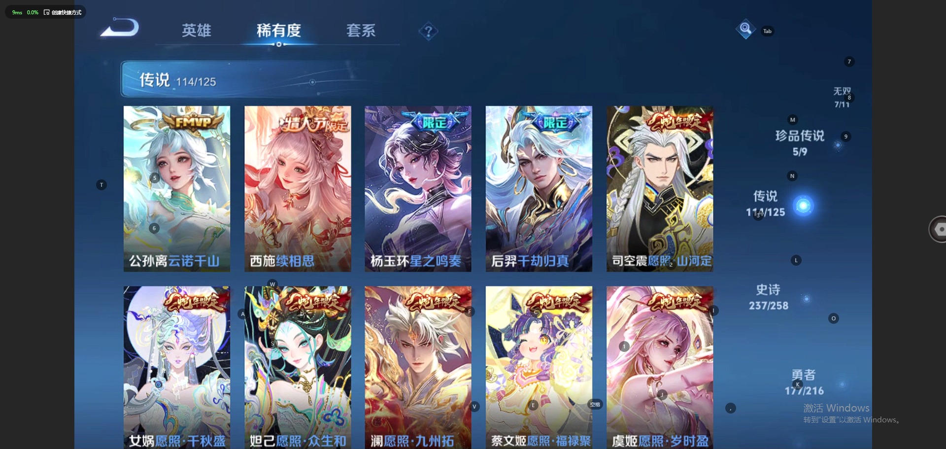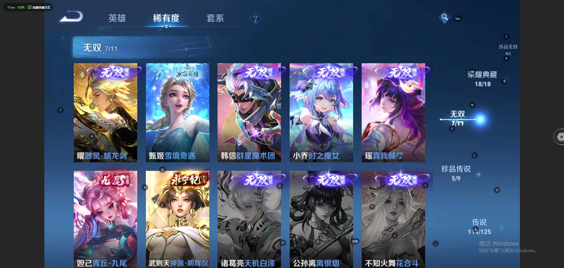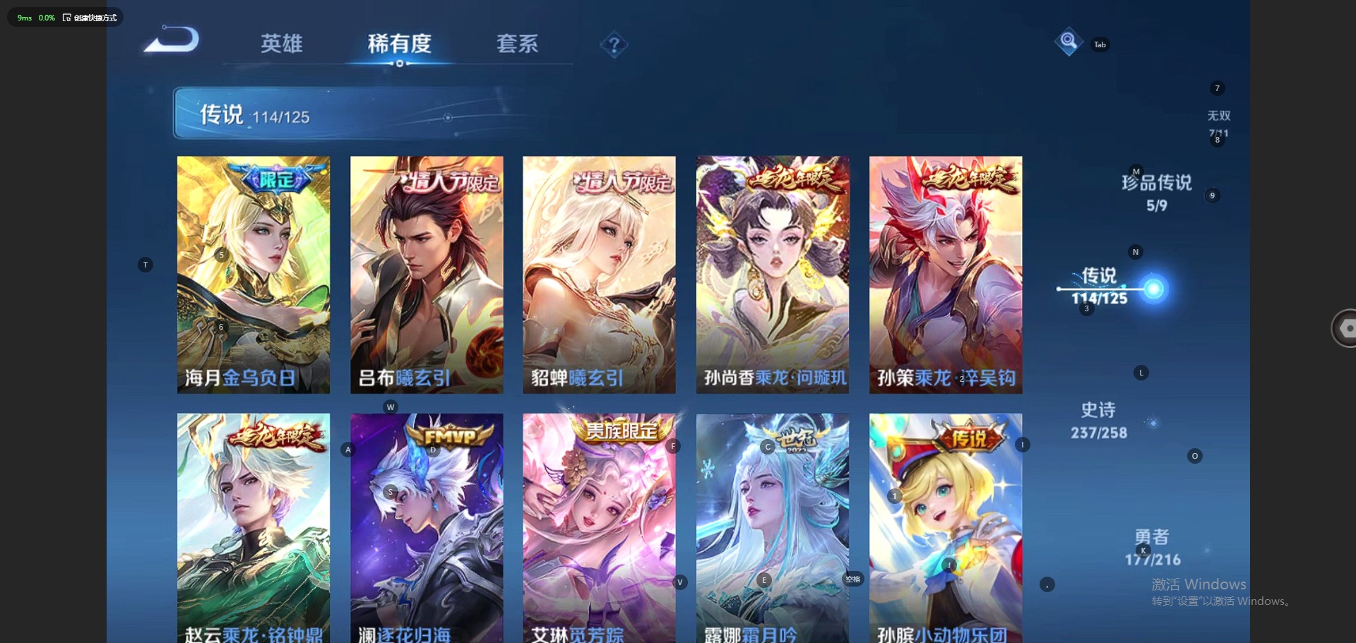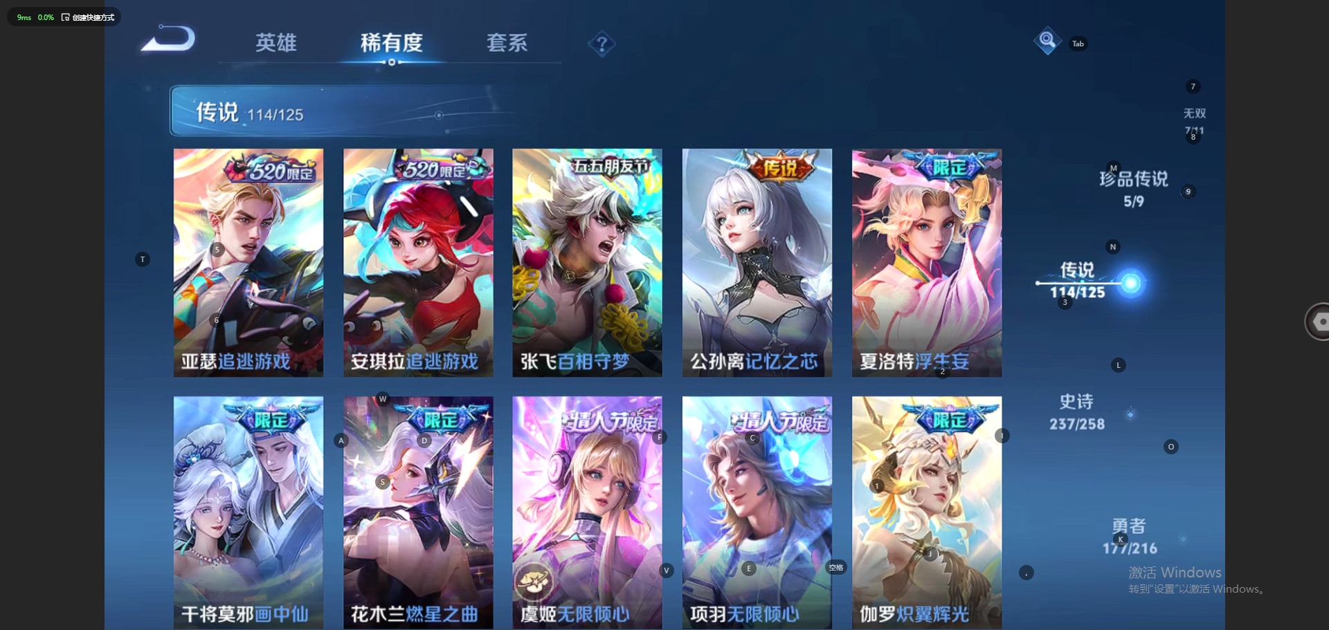 - [11625020]V7 7传说 104英雄 106皮肤 可修改实名 优质装备:久胜战神,末日机甲-孙尚香(绿蚂蚱),地狱火,仲夏夜之梦(大飞蛾),地狱之眼 限定皮:凤求凰(白切鸡),飞衡(韩信年限),梁祝,岱宗(典韦年限),李小龙,永曜之星,辉光之辰 史诗皮:石田雨龙,紫霞仙子,苍穹之光,电玩小子(小书包),白龙吟,黄金分割率,特工魅影,猫狗日记-孙策,节奏热浪,心灵骇客,暗隐猎兽者,缤纷独角兽,乘风破浪,逐浪之夏,水晶猎龙者,曙光守护者,圣诞恋歌,鹰眼统帅,魅力维加斯,未来纪元-赵云