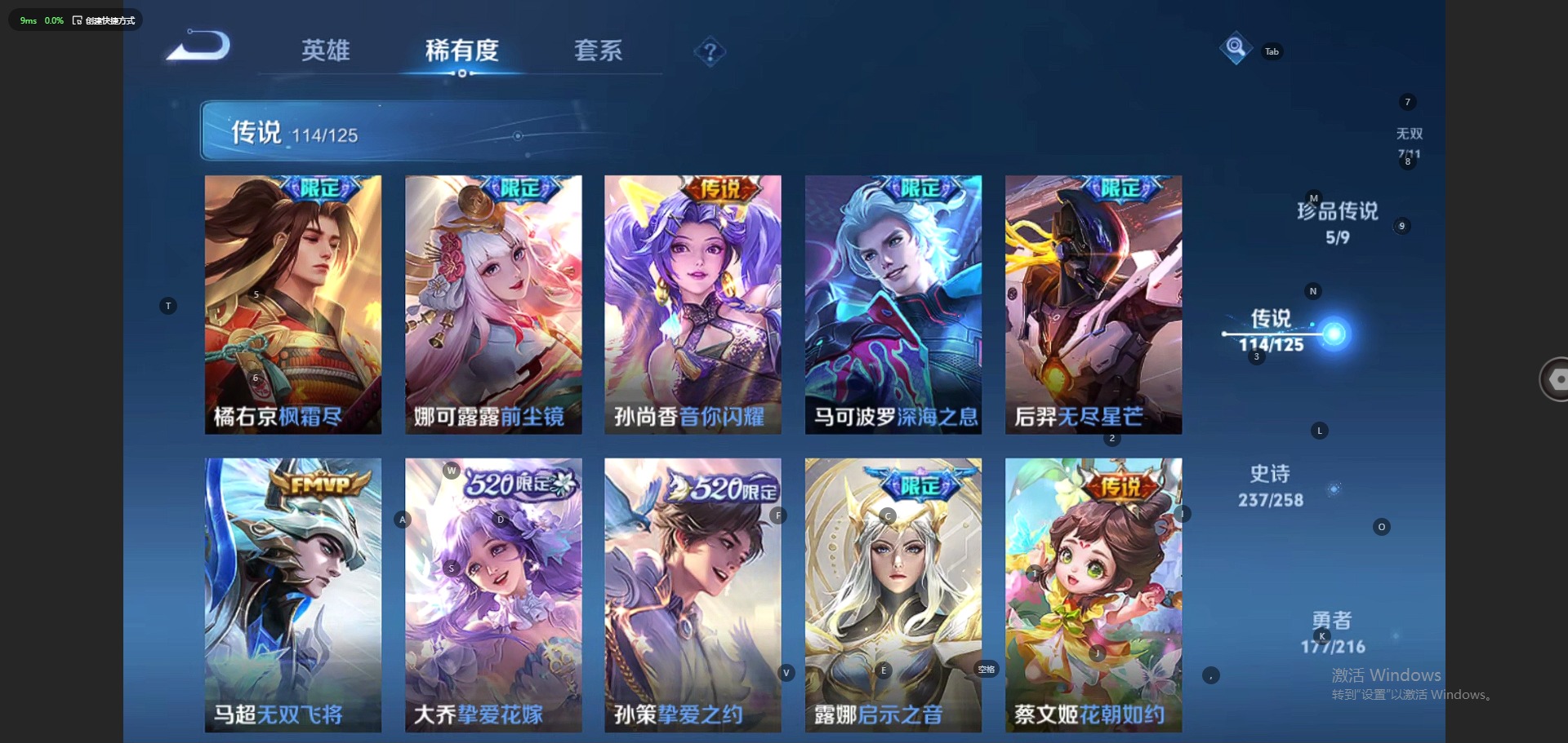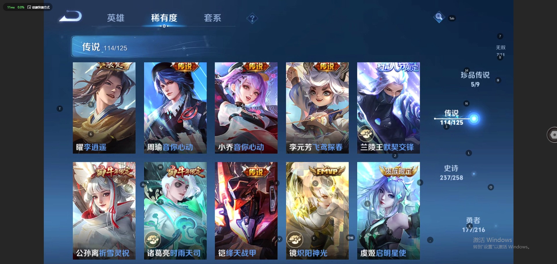 - [11678713]V8 1典藏 13传说 124英雄 168皮肤 可修改实名 优质装备:鸣剑·曳影,黄金白羊座,炽阳神光,一念神魔,云霓雀翎,末日机甲-孙尚香(绿蚂蚱),音你心动-小乔,地狱之眼,时之恋人-刘备(电焊工),神器·狴犴令,山海·苍雷引(电光曜子),澜逐花归海 珍宝阁皮:妄想食味 限定皮:鸣野蒿,傲雪梅枪,高山流水,岱宗(典韦年限),孙行者,神奇女侠,玉兔公主,神器·万象笔 史诗皮:蔬乡物语(鲁班七号),超元猎域,琥珀纪元伽罗,特工魅影,电玩·爆裂旋风,江河有灵,雪夜绮愿(周瑜),百解令(蒙犽),高渐离燃音魔法,偶像歌手,无限星赏官,末日机甲-吕布,猫狗日记-孙策,乱世虎臣,节奏热浪,女仆咖啡,摇滚巨星,水果甜心,星夜王子,心灵骇客,功夫厨神,德古拉伯爵,暗隐猎兽者,鬼剑武藏,心灵战警,地狱岩魂,诗语江南,纤云弄巧,乘风破浪,逐浪之夏,龙鼓争鸣,箭羽风息,金属风暴,圣诞恋歌,鹰眼统帅,魅力维加斯,赏金猎手,未来纪元-赵云