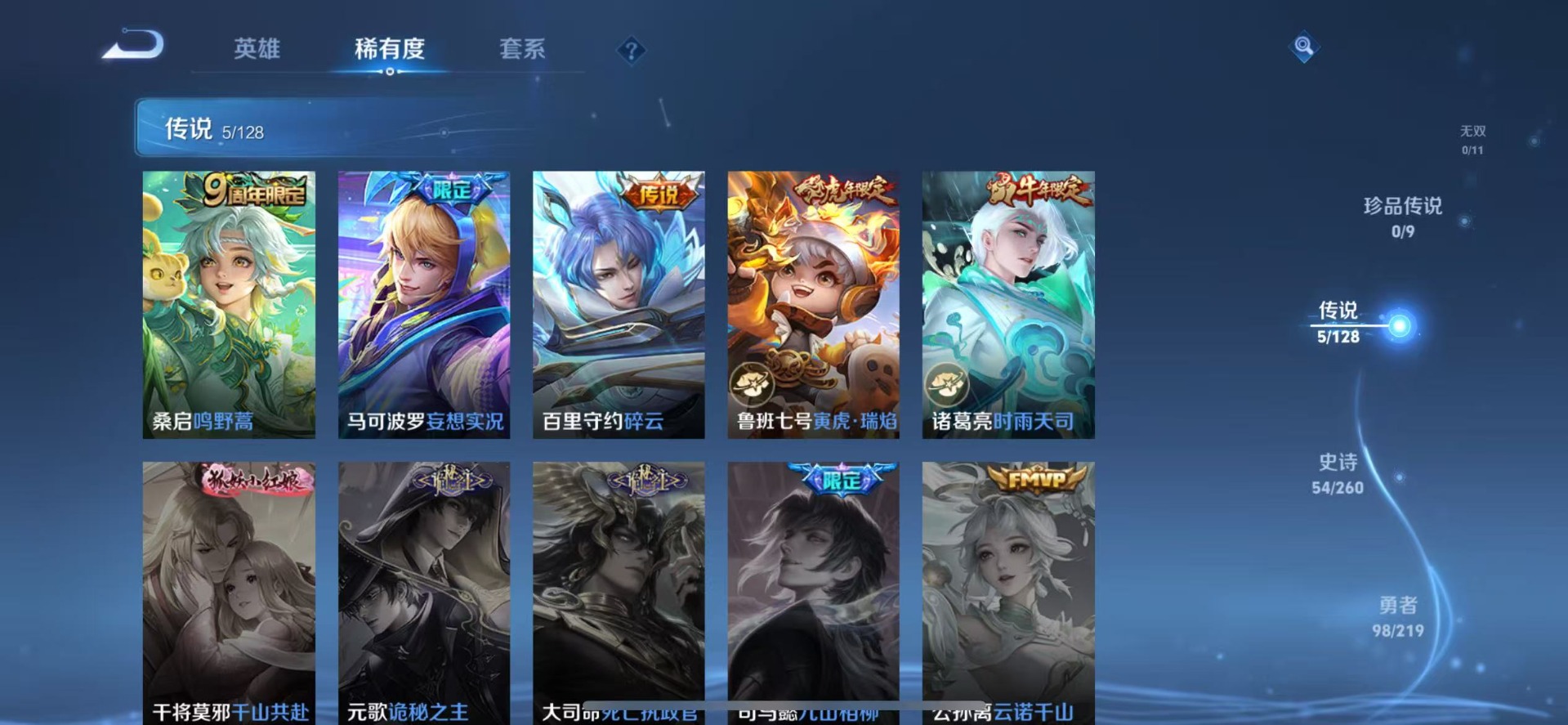 - [11965610]V7 1典藏 9传说 123英雄 227皮肤 可修改实名 优质装备:九霄神辉(木兰典藏),云鹰飞将(小将军),地狱火,地狱之眼 传说皮:云诺千山,祥瑞亨通,幻光神枪 珍宝阁皮:优雅恋人,女武神 限定皮:愿照·九州拓(澜年限),愿照·山河定(司空震年限),鸣野蒿,至尊宝,神威(电光马子),梁祝,天狼绘梦者,李小龙,大圣娶亲 史诗皮:化蝶舞,星界战将,龙之律动,茶境仙,蔬乡物语(鲁班七号),紫霞仙子,白龙吟,黄金分割率,特工魅影,蒙恬荣光圣徽,冰冠公主,偶像歌手,末日机甲-吕布,猫狗日记-孙策,猫狗日记-大乔,修罗,摇滚巨星,水果甜心,天才门将,星夜王子,功夫厨神,德古拉伯爵,暗隐猎兽者,幽灵船长,心灵战警,舞动绿茵,地狱岩魂,纤云弄巧,繁星吟游(呼啦呼啦),拒霜思,乘风破浪,逐浪之夏,月团寄思,水晶猎龙者,曙光守护者,箭羽风息,金属风暴,原初追逐者,圣诞狂欢,圣诞恋歌,鹰眼统帅,王者之锤,魅力维加斯,黎明之约