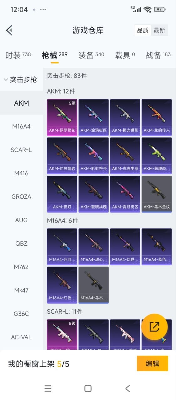 AKM-绿萝繁花,SCAR-L-锦绣绵绵,M416-电玩时刻,GROZA-镜光银凌,Kar98K-巳巳如意,AWM-橘柚倾心