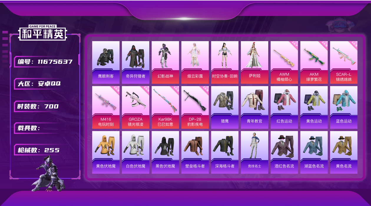 [11675637]4粉装 7特效枪 6印记 可二次 可修改实名 优质装备:奇异狩猎者,幻影战神,AWM橘柚倾心,AKM绿萝繁花,SCAR-L-锦绣绵绵,七级AWM-橘柚倾心,M416电玩时刻,时空协奏·回响,GROZA-镜光银凌,萨利娅,Kar98K-巳巳如意 热门装扮:烟云彩露,鹰眼刺客 稀有枪皮:DP-28-豹影疾电 五级特效枪:五级GROZA-镜光银凌,五级Kar98K-巳巳如意,五级DP-28-豹影疾电,五级M416-电玩时刻,五级SCAR-L-锦绣绵绵,五级AKM-绿萝繁花 紫色装扮:SS22特训,SS23特训,娇憨猪猪,萌趣咩咩,SS21特训,熠彩粉晶,SS31特训套装,六六大吉,军械专家,冰川特警,冷焰舞者,北国孤狼,霓虹热舞,SS30特训套装,云朵鹅,雪绒豹,SS33特训套装,SS20特训,青春冒险家,光影梦想家,潮流游乐家,SS15特训,暗夜傀儡,时空追击者,暴风机械师,SS16特训,银白舞王,SS13特训,超能拳王,星梦畅游,治愈之星,科技之星,SS14特训,萌趣颜团子,特种颜团子,猎梦纪元,飞驰魅影,音速流光,极速竞梦,SS19特训,吉莉礼服,甜心亚梦,虚音幻奏,瑞龙福将,团圆交子,SS17特训,SS18特训,壁垒格斗者,都市漫游者,酒红色名流,长空猛禽,雪山精英,霓虹街区,青年教官,迎春赐吉,缤纷果语,耀眼新星,荣耀,蓝彩潮人,蓝色运动,虎虎生威吉莉,跃动心情,飞行日记,龙腾端午,魅力单车,麻辣教官,黄色伏地魔,黄色名流,黄色运动,黑色伏地魔,龟仙人,冰河战士,龙魂突击队,蝶变,沙漠毒蛇,柠萌假日,格斗先锋,沙漠兵团,海岛探路者,涂山之恋,深海格斗者,深蓝色名流,滨海假日,幻影武者,坚韧舞者,夏日音浪,幻世战舞者,战地督导,探宝勇士,湖蓝色名流,滨海厨神,绮丽涂鸦,疯狂小兔子,白色伏地魔,破晓战魂,神秘领域,甜蜜告白,空岛之星,突袭者,竞技勇士朋克,竞技达人朋克,红色运动,王牌教练,潮流先锋,牛气冲天,灰色守护者,灰色格斗者,灼焰舞者,炫蓝之夏,热血青春,牛气满满,猛禽,特殊使命,特训学院,猎鹰,镭射皇者,雏菊兔兔,萝兰蝴蝶,SS29特训,极冰使者,湖畔霞光,星途旅人,创世·幻影,纯真浪花,热情海星,SS28特训,鱼渊荷华,玉兔迎春,燕燕于飞,青团波波,糖糖葫芦,竞技名士,摩登魅猫,街头风暴,情公主,惊鸿侠骨,神气柴柴,懵萌河马,SS24特训(SS24特训套