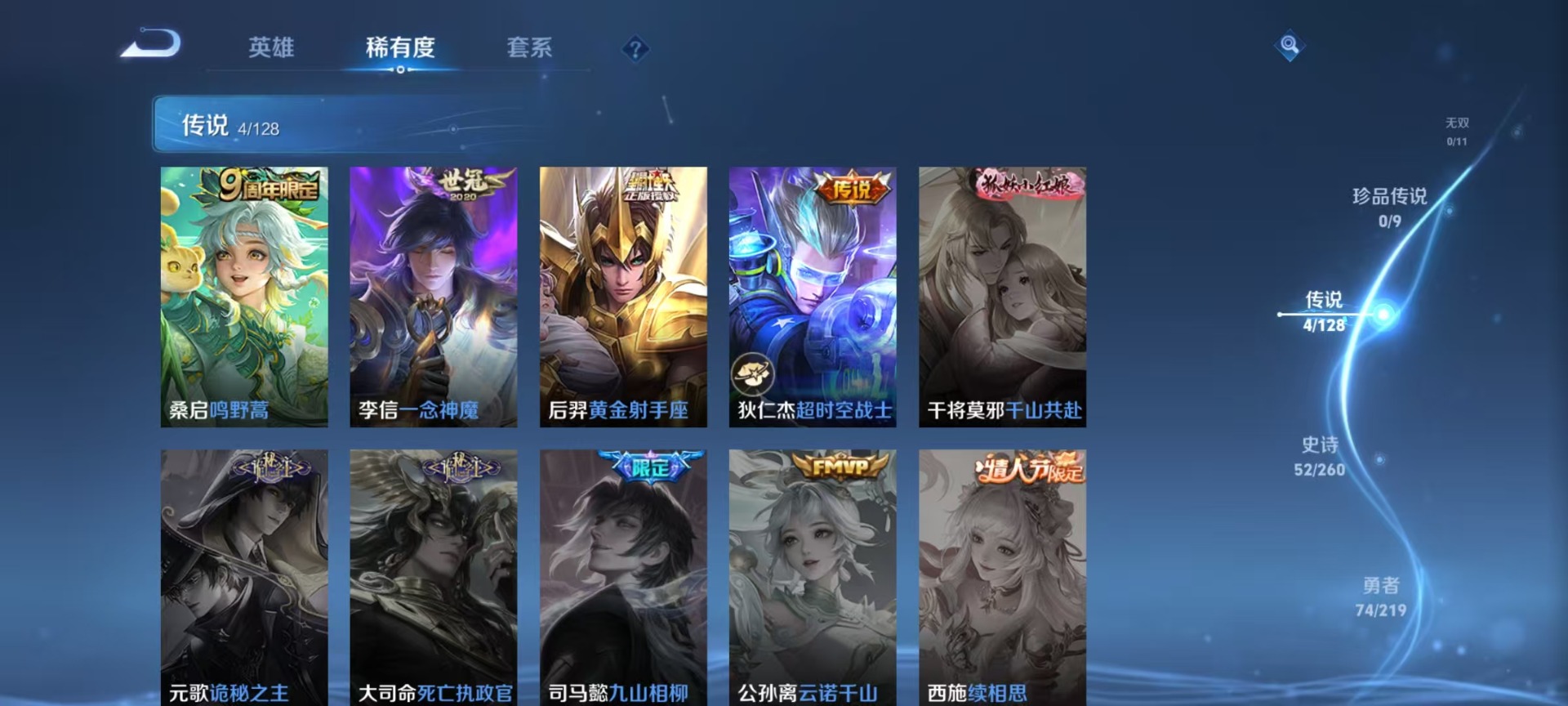 - [11819140]V7 1典藏 16传说 123英雄 174皮肤 可修改实名 女号 优质装备:鸣剑·曳影,黄金射手座,冠军飞将,炽阳神光,地狱火,地狱之眼,无双飞将,山海·苍雷引(电光曜子),炽翼辉光(娃娃菜牛角包),妄想实况,鹤归松栖(云缨),夜礼服假面 传说皮:乘龙·问璇玑(孙尚香年限),乘龙·铭钟鼎(赵云年限),落雪白狼,续相思 珍宝阁皮:优雅恋人 限定皮:愿照·岁时盈(虞姬年限),五谷丰年,梁祝,逐梦之翼,默契交锋-花木兰,山海·玄木吟(马可年限) 史诗皮:苍鳞隐世,星界战将,谪仙醉月,石田雨龙,茶境仙,夜落电台,超元猎域,紫霞仙子,苍穹之光,特工魅影,千年之狐,永昼,江河有灵,匿光侦查者,百解令(蒙犽),高渐离燃音魔法,蒙恬荣光圣徽,无限星赏官,冰冠公主,偶像歌手,末日机甲-吕布,猫狗日记-孙策,时之恋人-孙尚香,节奏热浪,女仆咖啡,水果甜心,天才门将,德古拉伯爵,暗隐猎兽者,幽灵船长,鬼剑武藏,心灵战警,地狱岩魂,乘风破浪,水晶猎龙者,曙光守护者,金属风暴,原初追逐者,圣诞狂欢,鹰眼统帅,暗夜贵公子,魅力维加斯,赏金猎手