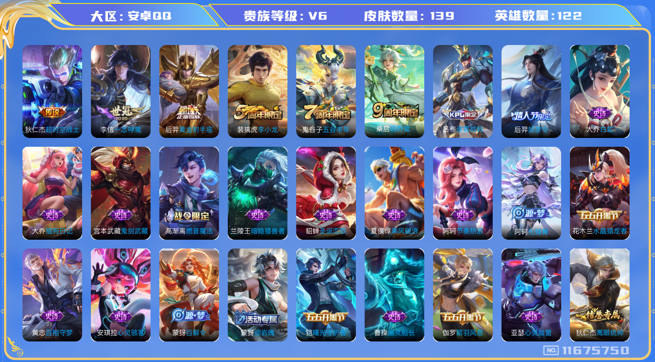[11675750]V6 4传说 122英雄 139皮肤 可修改实名 女号 优质装备:黄金射手座,一念神魔,超时空战士-狄仁杰 珍宝阁皮:妄想食味 限定皮:逐霄战戟,鸣野蒿,五谷丰年,李小龙,如梦令-后羿 史诗皮:鸭鸭历险记-刘禅,化蝶舞,石田雨龙,百相守梦-周瑜,茶境仙,蒙犽顽岩魄,埋骨钱,百相守梦-百里守约,百相守梦-黄忠,紫霞仙子,电玩小子(小书包),黄金分割率,特工魅影,江河有灵,百解令(蒙犽),高渐离燃音魔法,白蛇,末日机甲-吕布,猫狗日记-大乔,时之恋人-孙尚香,节奏热浪,水果甜心,绅士熊喵,心灵骇客,功夫厨神,暗隐猎兽者,幽灵船长,鬼剑武藏,心灵战警,舞动绿茵,缤纷独角兽,乘风破浪,逐浪之夏,水晶猎龙者,曙光守护者,箭羽风息,金属风暴,圣诞恋歌,鹰眼统帅,魅力维加斯,赏金猎手,无心,未来纪元-赵云