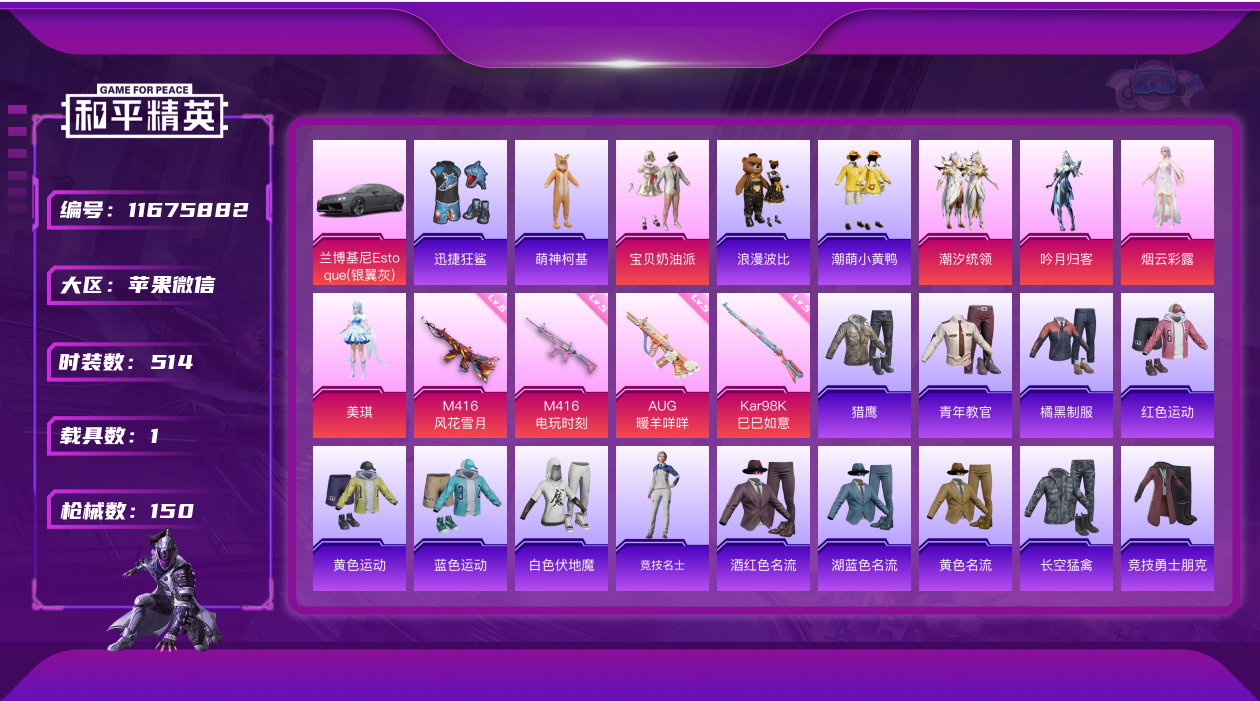 [11675882]5粉装 4特效枪 1载具 9印记 可二次 可修改实名 永久社交场景限制 身法装备:8号机(新粉螳螂) 优质装备:兰博基尼Estoque(银翼灰),宝贝奶油派,潮汐统领,M416风花雪月,M416电玩时刻,AUG-暖羊咩咩,Kar98K-巳巳如意 热门装扮:吟月归客,烟云彩露,美琪,萌神柯基,潮萌小黄鸭,迅捷狂鲨,浪漫波比 六级特效枪:六级M416-风花雪月 五级特效枪:五级Kar98K-巳巳如意,五级AUG-暖羊咩咩,五级M416-电玩时刻 紫色装扮:田园牧歌,轻风白浪,SS22特训,SS23特训,幻彩翩翩,妙红点点,娇憨猪猪,萌趣咩咩,暖心熊熊,SS21特训,熠彩粉晶,SS31特训套装,SS5特训,人气偶像,冰川特警,北国孤狼,霓虹热舞,SS30特训套装,云朵鹅,雪绒豹,SS33特训套装,顶瓜瓜,SS20特训,爆裂葡萄,骁骑迪迦,治愈之星,科技之星,SS14特训,SS19特训,瑞龙福将,团圆交子,SS17特训,异彩先驱,SS18特训,都市魅力,酒红色名流,长空猛禽,雪山精英,霓虹极客,霓虹街区,青年教官,迎春赐吉,风暴特警,荷畔雨呱,缤纷果语,耀动青春,蓝色守护者,蓝色运动,西部风情,跃动心情,龙腾端午,魅力单车,黄色名流,黄色运动,龟仙人,香桃花海,橘黑制服,海岛探路者,深蓝色名流,圣诞大吉,夏日倾情,完美偶像,帅气教官,幻世战舞者,怒火燎原,战地菁英,湖蓝色名流,绮丽涂鸦,疯狂小兔子,白色伏地魔,破蛋小黄鸡,空投萌叽,竞技勇士朋克,竞技达人朋克,红色运动,甜蜜熊情侣,灼焰舞者,燃烧卡路里,牛气满满,特战装甲,特殊使命,特训学院,猎鹰,SS29特训,星途旅人,白光莹,纯真浪花,热情海星,曼妙人鱼,SS28特训,迎夏光舞,听雨铃兰,奶油梦幻熊,8号机(新粉螳螂),冰公主,异域银装,石蕴玉辉,鱼渊荷华,燕燕于飞,巳巳如意,竞技名士,街头风暴,小狗蛇点点,SS24特训(SS24特训套装),SS27特训,萌趣绒叽,精神漫游,炽焰拳师,格斗专家,SS6特训,核芯基因,SS7特训,摇滚狂鲨,深蓝冒险家,迷域探索者,拳皇97草薙京,顽皮玉兔,花式比心,折纸暴龙,云纹魔法士,SS8特训,玄武圣者,大橘大利,SS12特训,纯白誓言,SS9特训,暗夜契约,SS11特训,耀粉歌者,SS32特训服(SS32特训套装),青玉碎影,白糯汤圆,恋语绒绒,冷酷挑战者,丛林猎人,传奇侦探