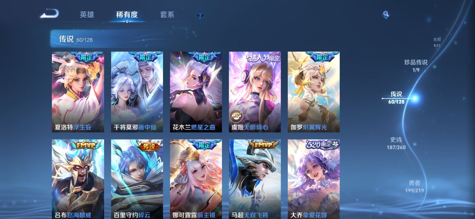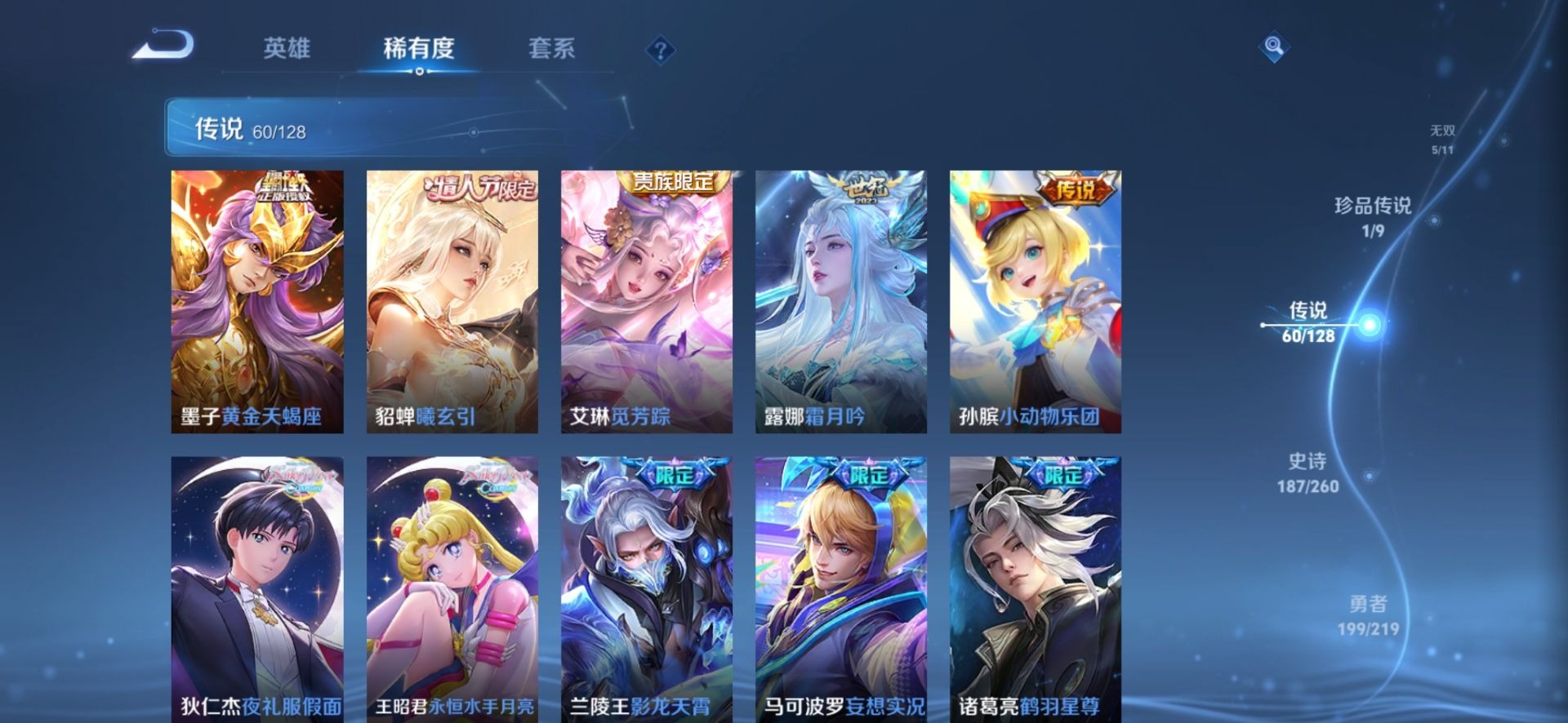 夏侯惇朔风刀,曹操烛龙,苏烈千军破阵,牛魔御旌,项羽苍威无极,镜青焰无极,庄周蜃楼王,裴擒虎擒涛扼浪,蒙犽狂想玩偶喵,马可波罗暗影游猎,鬼谷子原初探秘者,张良古海寻踪,芈月重明,扁鹊炼金王,虞姬凯尔特女王,刘邦夺宝奇兵,沈梦溪星空之诺,沈梦溪大漠名商,孙膑妖精王,典韦穷奇,典韦蓝屏警告,达摩沙漠行僧,鲁班七号狮舞东方,吕布猎兽之王,元歌云间偶戏,兰陵王金庭之子,鲁班大师探海日志,明世隐疑决卦,白起狰,亚瑟狮心王,女娲朔望之晖,桑启海盐诗旅,狄仁杰万华元夜,程咬金演武夺筹,李元芳银河之约,李元芳云中旅人,弈星混沌棋,钟馗神迹守卫,钟馗驱傩正仪,太乙真人饕餮