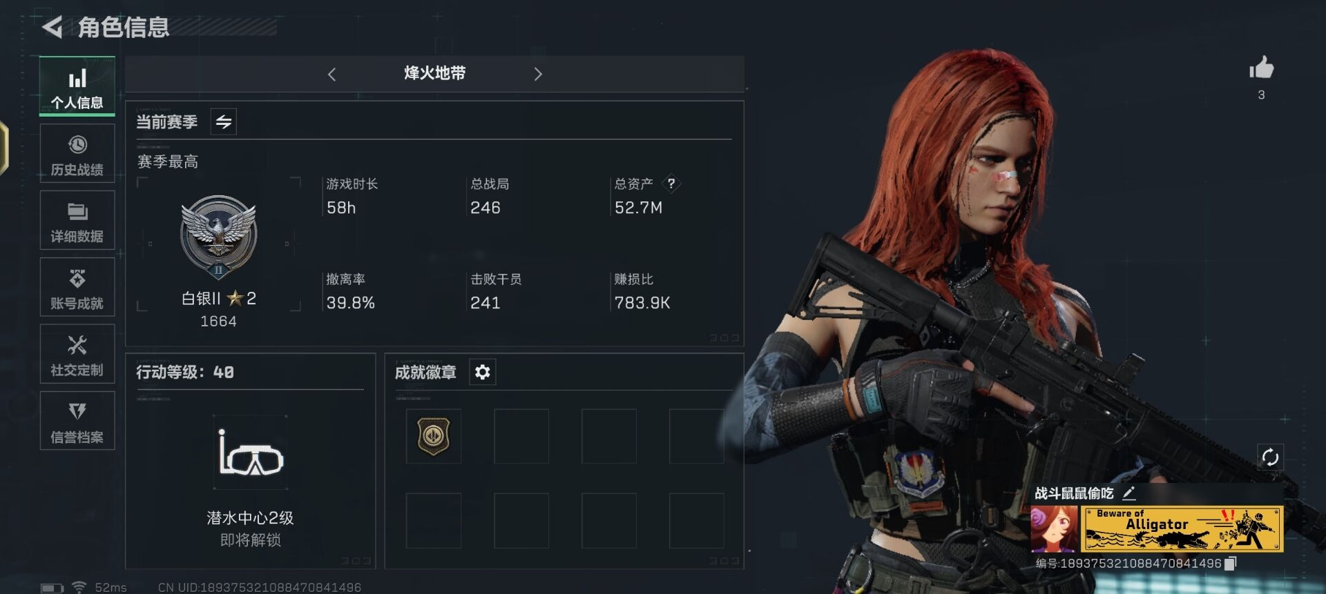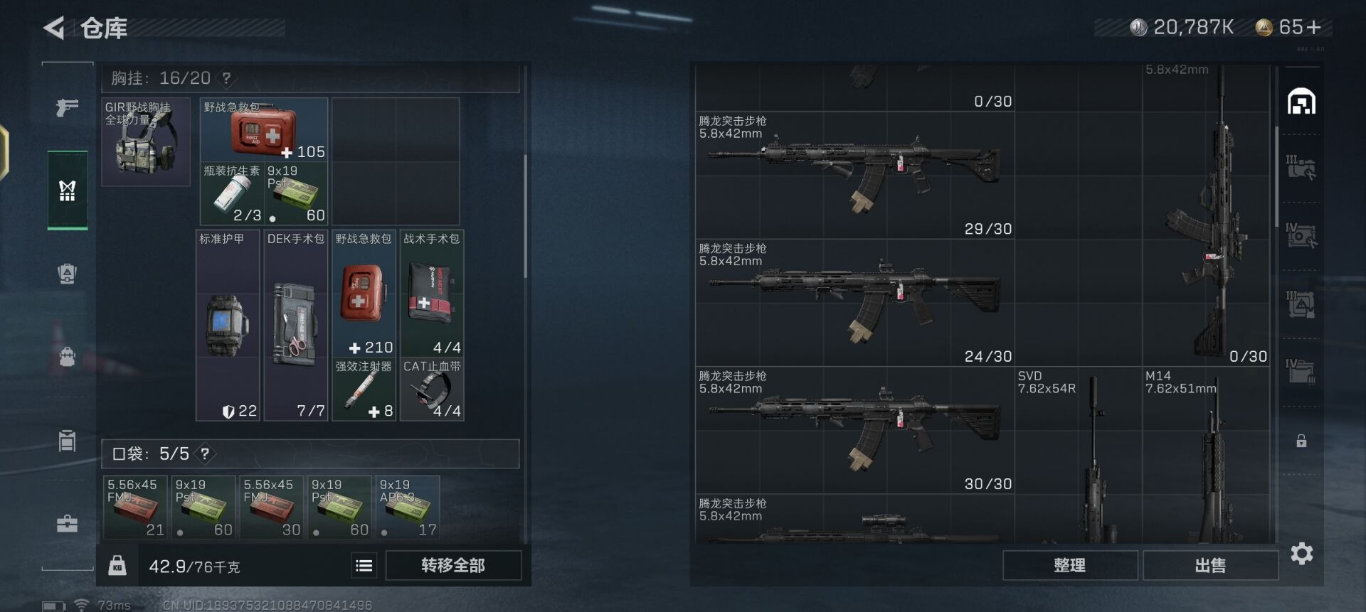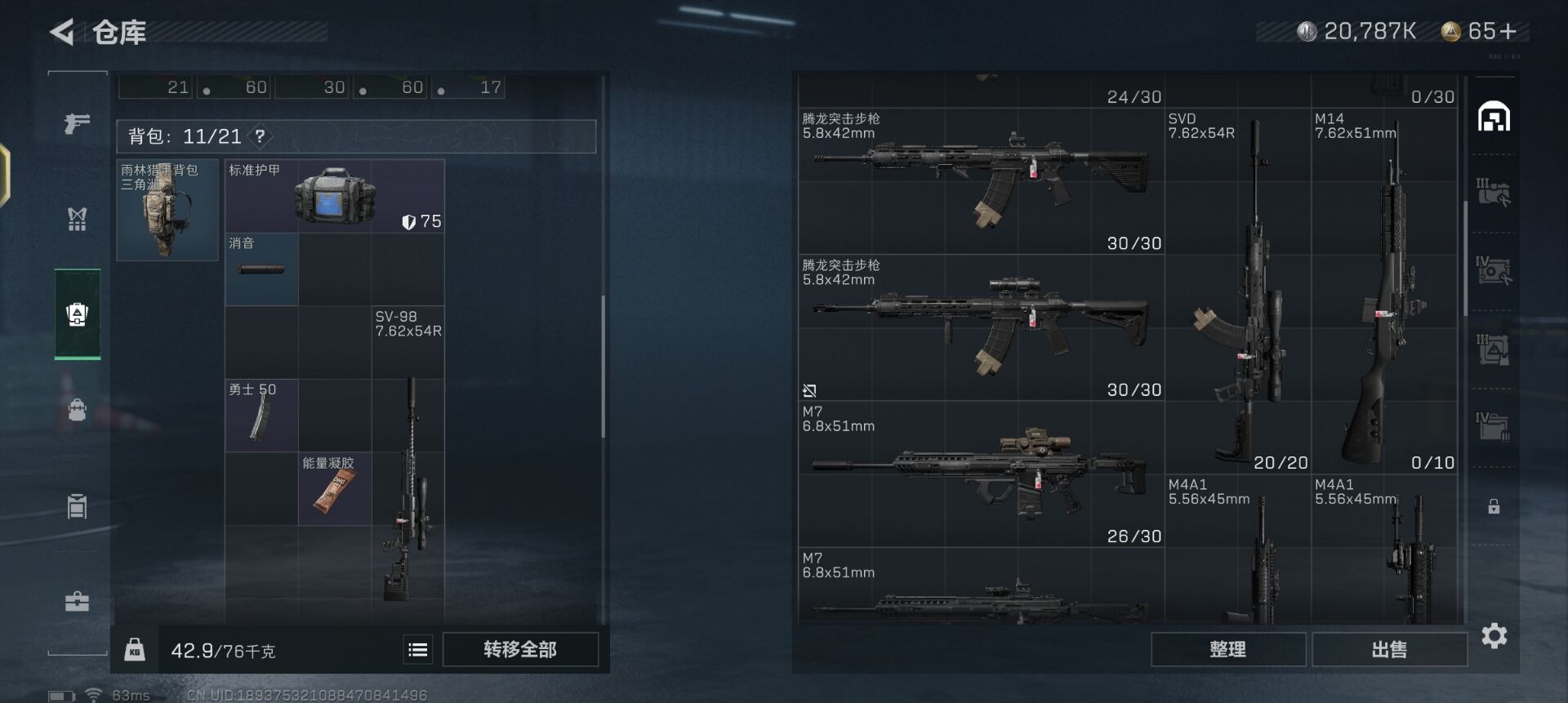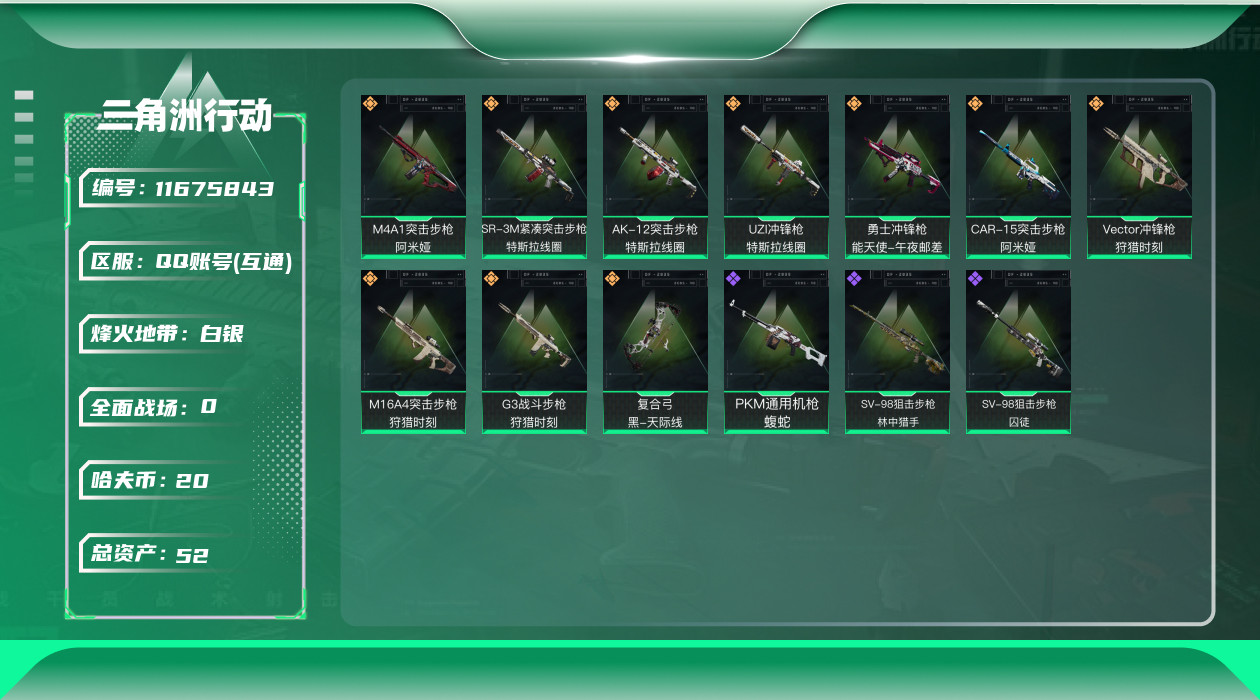 [11675843]总资产:52.7M 10传说枪械 哈夫币:20.787K 进阶安全箱(9.17到期) 可二次 可修改实名 烽火地带段位:白银 全面战场段位:军士长 传说武器皮肤:UZI冲锋枪-特斯拉线圈,M16A4突击步枪-狩猎时刻,AK-12突击步枪-特斯拉线圈,SR-3M紧凑突击步枪-特斯拉线圈,勇士冲锋枪-能天使-午夜邮差,Vector冲锋枪-狩猎时刻,G3战斗步枪-狩猎时刻,复合弓-黑-天际线,M4A1突击步枪-阿米娅,CAR-15突击步枪-阿米娅 史诗武器皮肤:PKM通用机枪-蝮蛇,SV-98狙击步枪-林中猎手,SV-98狙击步枪-囚徒