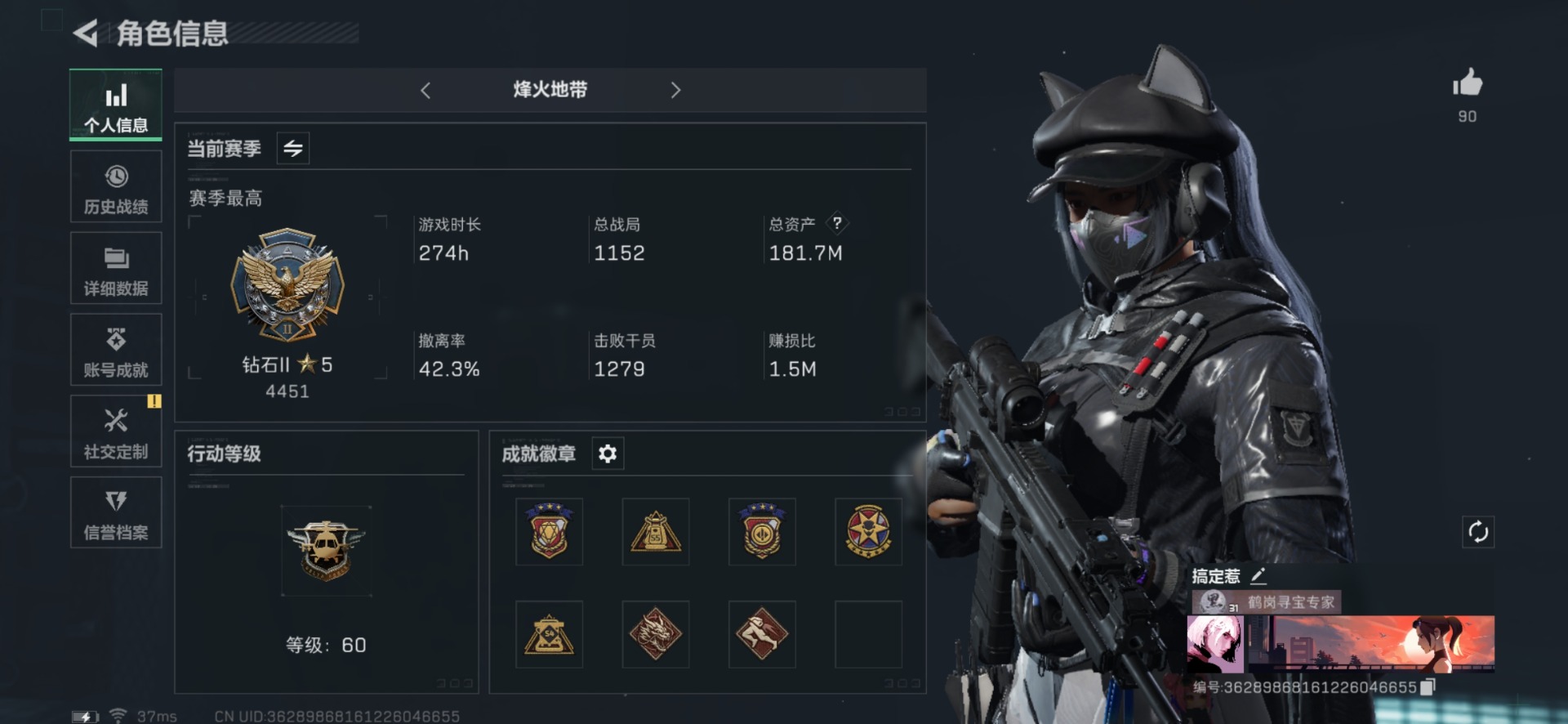 [11675965]总资产:181.7M 1干员外观 15传说枪械 哈夫币:12.218K 顶级安全箱(3×3)9.15号到期 可二次 可修改实名 优质装备:顶级安全箱(3x3) 烽火地带段位:钻石 全面战场段位:列兵 传说武器皮肤:SR-25射手步枪-水墨云图,SCAR-H战斗步枪-铁艺苍穹,SMG45冲锋枪-骑士,UZI冲锋枪-特斯拉线圈,AWM狙击步枪-捞点薯条,腾龙突击步枪-捞点薯条,93R-捞点薯条,AK-12突击步枪-特斯拉线圈,SR-3M紧凑突击步枪-特斯拉线圈,勇士冲锋枪-能天使-午夜邮差,复合弓-黑-天际线,725双管霰弹枪-送葬人-无题密令,M4A1突击步枪-阿米娅,CAR-15突击步枪-阿米娅,AK-12突击步枪-夜鹰 干员外观:露娜-黑·天际线