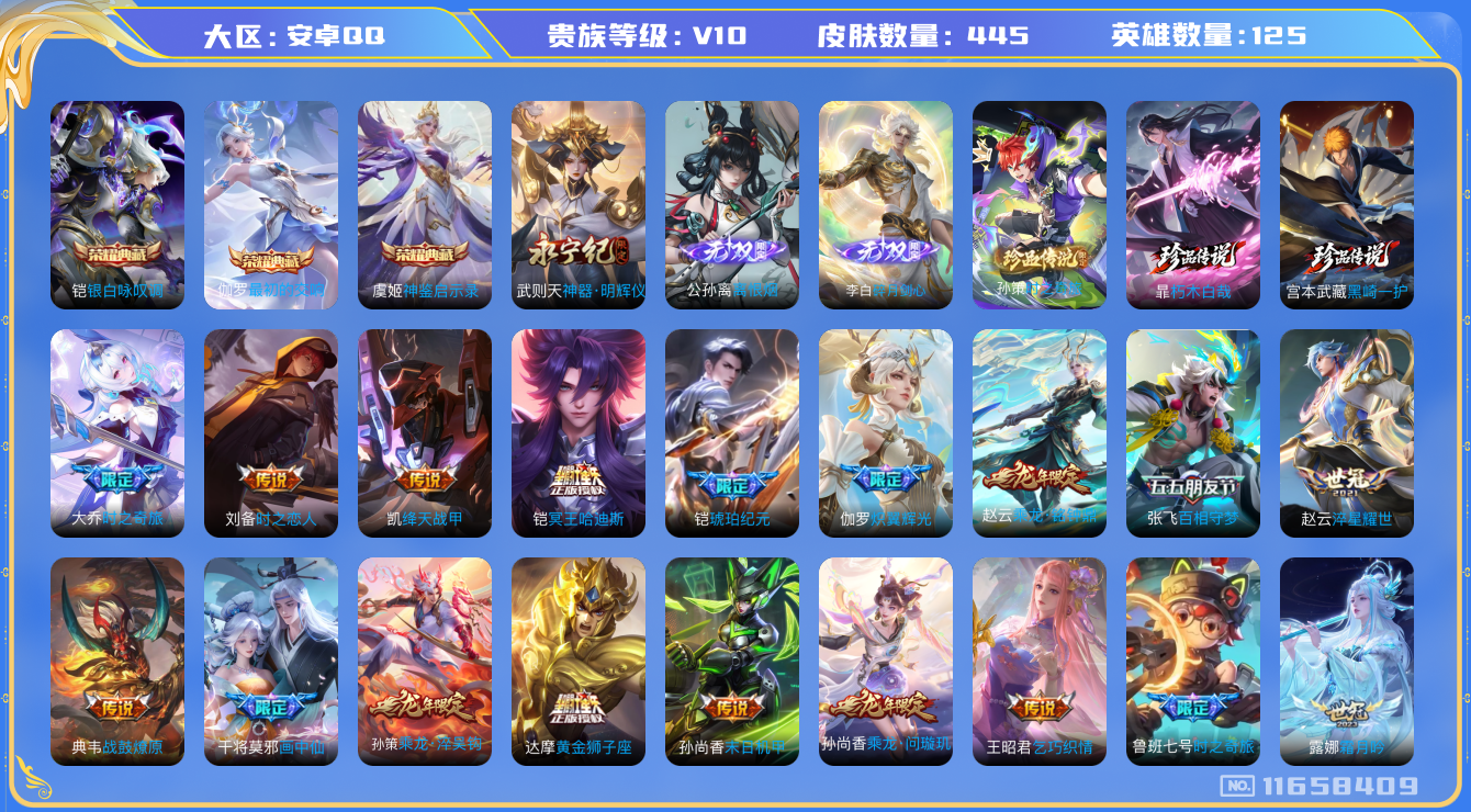 [11658409]V10 3典藏 3无双 3珍品传说 65传说 125英雄 445皮肤 可修改实名 优质装备:银白咏叹调(倪克斯侍卫),神器·明辉仪,碎月剑心(李白无双),神鉴启示录,离恨烟(公孙离无双),最初的交响(伽罗典藏),朽木白哉,黑崎一护,黄金狮子座,黄金射手座,云鹰飞将(小将军),绛天战甲(鸡嘴战神),黄金白羊座,猫影幻舞,末日机甲-孙尚香(绿蚂蚱),地狱之眼,胖达荣荣,乞巧织情,时之恋人-刘备(电焊工),游龙清影(小青龙),淬星耀世,碎云,天秀幻梦,神器·明辉仪,炽翼辉光(娃娃菜牛角包),画中仙,浮生妄,记忆之芯(机甲兔),百相守梦(张飞),灼幽烈阳,鹤归松栖(云缨),遇见神鼓,鲁班七号-时之奇旅,大乔-时之奇旅,永恒水手月亮,夜礼服假面,霜月吟,澜逐花归海,艾琳觅芳踪,琥珀纪元铠,琥珀纪元马超,黄金天蝎座,朵莉亚心动手记,牧神诗旅,玄雷天君,涂山容容 珍品传说:时之奇旅-孙策 传说皮:乘龙·问璇玑(孙尚香年限),乘龙·铭钟鼎(赵云年限),乘龙·淬吴钩(孙策年限),貂蝉曦玄引,吕布曦玄引,典韦战鼓燎原,落雪白狼,铠冥王哈迪斯,续相思,星之鸣奏,祥瑞亨通,幻光神枪 珍宝阁皮:万物之道,蔷薇恋人 限定皮:愿照·九州拓(澜年限),愿照·福禄聚(蔡文姬年限),愿照·岁时盈(虞姬年限),愿照·山河定(司空震年限),愿照·众生和(妲己年限),愿照·千秋盛(女娲年限),陌上桑,鸣野蒿,夏侯惇霜北刀,至尊宝,傲雪梅枪,寅虎·展翼(孙膑年限),绯月行,白鹤梁神女,魔法小厨娘,白晶晶,时雨天司(水龙头),飞衡(韩信年限),瑞麟志(木兰年限),至美·乘鲤谣,至美·化雀舞,影龙天霄,怒海麟威,五谷丰年,冰锋战神,游园惊梦,御风骁将(吕布年限),龙胆,烈魂,岱宗(典韦年限),虎魄,天狼征服者,奔雷神使(牛魔年限),祈雪灵祝(雪兔子),玄武志(苏烈年限),奇迹圣诞,默契交锋-花木兰,孙行者,猪悟能,冰霜恋舞曲,乒乒小将,女儿国国王,寅虎·御盾(廉颇年限),寅虎·瑞焰(虎皮蛋子),寅虎·心曲(虎婆),寅虎·赤拳(老虎年限),玉兔公主,深海之息(深海大菠萝),唐三藏,匿光启智者,时之奇旅-妲己,神器·万象笔,梦圆繁星 史诗皮:赞萌露比,鸭鸭历险记-刘禅,飞车小橘子,苍鳞隐世,器灵·浮梦炉,糖绘人间,狼魂孤将,化蝶舞,星界战将,谪仙醉月,龙之律动,石田雨龙,百相守梦-周瑜,茶境仙,怒海争锋,炽弈燎原