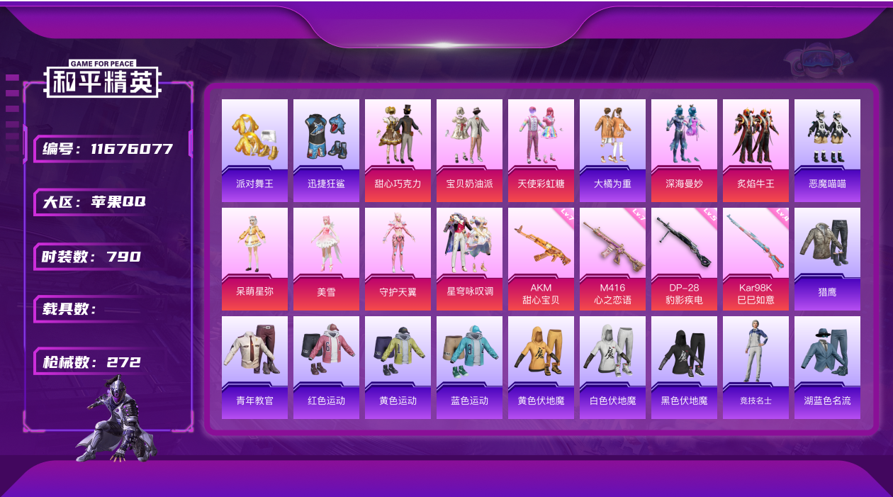 - PX_2093663- 安卓手Q-12王牌印记-9粉装-5特效枪-3载具-71971热力值-147套装-202枪皮-0卓越印记-0传奇印记 【9粉装】,梦幻火箭,放客神游,第五大道,蔷薇星,智能音符,歌者泠鸢,香水柠檬,金丰海韵,呆萌星弥 【5特效枪】AKM-梦之光华-7级 SCAR-L-纯梦嫁纱-7级 M416-女娲灵识-3级 AUG-超新星-7级 Kar98K-巳巳如意-5级 【2稀有紫装】