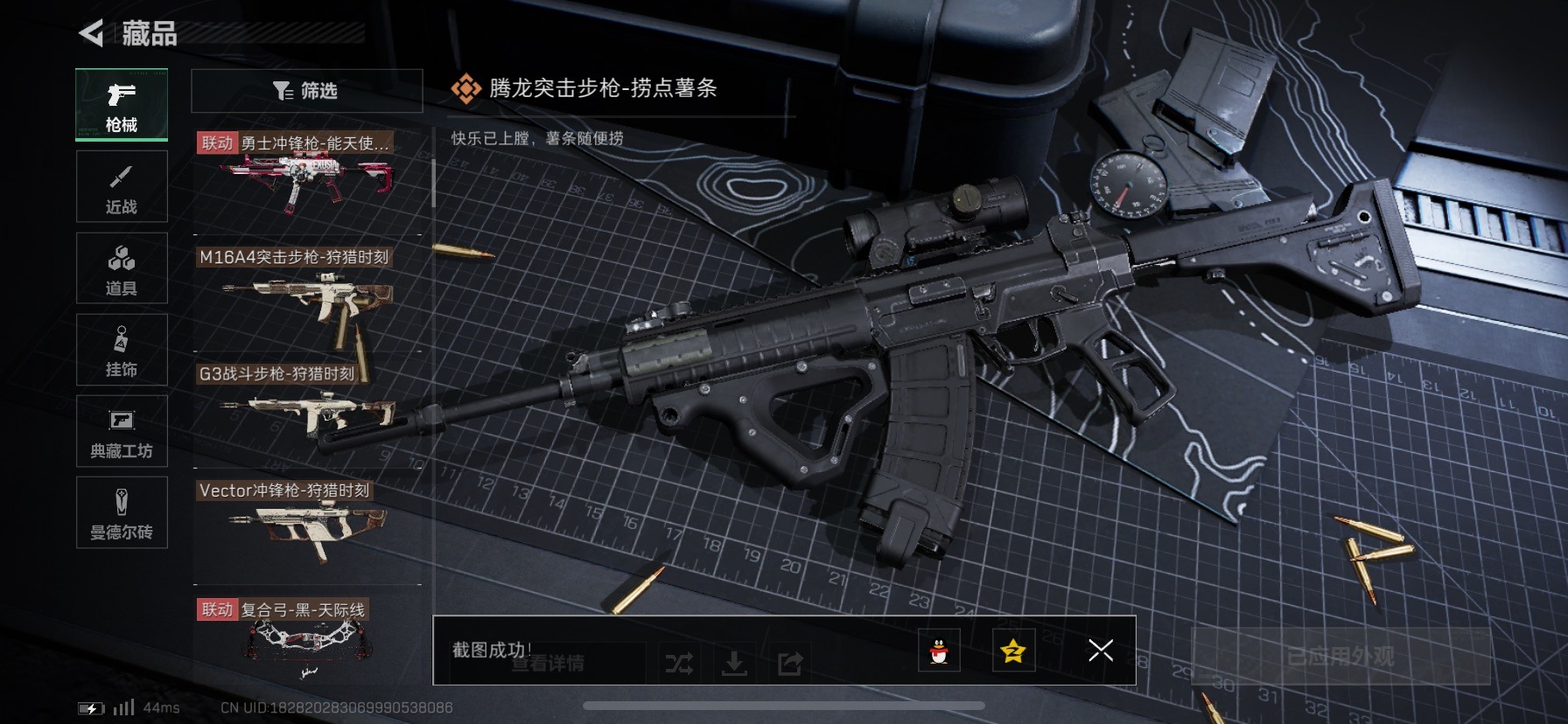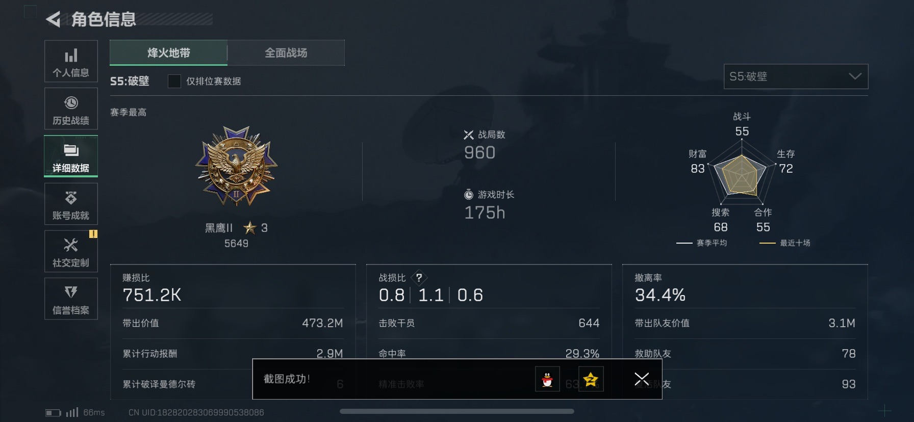 - [11651081]总资产:145.1 2干员外观 6传说枪械 顶级安全箱(9.17到期) 可二次 可修改实名 烽火地带段位:钻石 全面战场段位:校官 哈夫币:33.739 传说武器皮肤:AK-12突击步枪-夜鹰,复合弓-黑-天际线,CAR-15突击步枪-阿米娅,725双管霰弹枪-送葬人-无题密令,P90冲锋枪-神秘艺术,CAR-15突击步枪-黑鹰坠落 史诗武器皮肤:SR-3M紧凑突击步枪-英雄,M700狙击步枪-蝮蛇,PKM通用机枪-荒野求生,AS Val突击步枪-尖端治疗,M700狙击步枪-守夜人,SG552突击步枪-尖端治疗,Ash-12战斗步枪-守夜人,SR-3M紧凑突击步枪-荒野求生,SG552突击步枪-深海恐惧,AKM突击步枪-林中猎手,.357左轮-幸运时刻,SVD狙击步枪-暗夜猎手,M16A4突击步枪-竞赛选手,PKM通用机枪-守夜人,SVD狙击步枪-荒野求生,M1014霰弹枪-林中猎手,SV-98狙击步枪-林中猎手,PSG-1射手步枪-无垢,AS Val突击步枪-典狱官,M250通用机枪-囚徒,SV-98狙击步枪-囚徒,腾龙突击步枪-无垢,MP7冲锋枪-无垢,QBZ95-1突击步枪-曙光,沙漠之鹰-曙光,Vector冲锋枪-阿萨拉文明,M14射手步枪-黑鹰坠落,QSZ92G-风林火山,93R-博士 干员外观:威龙-飞虎,露娜-黑·天际线