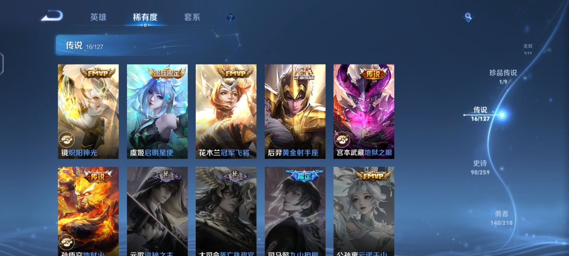 - [11677811]V7 1典藏 1珍品传说 3传说 124英雄 240皮肤 可修改实名 优质装备:星空梦想(太空人),怪盗基德,末日机甲-孙尚香(绿蚂蚱),仲夏夜之梦(大飞蛾),末日机甲-孙策 珍宝阁皮:蔷薇恋人,女武神 限定皮:傲雪梅枪,时之彼端,飞衡(韩信年限),五谷丰年,梁祝,李小龙,如梦令-后羿,猪悟能,一生所爱,青春决赛季,冰霜恋舞曲,蜜橘之夏,匿光追影者 史诗皮:遇见神鹿,紫霞仙子,电玩小子(小书包),黄金分割率,特工魅影,永昼,魅语,冰冠公主,晚萤,电玩·爆裂旋风,末日机甲-吕布,猫狗日记-孙策,乱世虎臣,女仆咖啡,摇滚巨星,水果甜心,天才门将,星夜王子,心灵骇客,暗隐猎兽者,幽灵船长,鬼剑武藏,心灵战警,舞动绿茵,地狱岩魂,纤云弄巧,拒霜思,缤纷独角兽,乘风破浪,逐浪之夏,水晶猎龙者,曙光守护者,箭羽风息,金属风暴,原初追逐者,圣诞狂欢,圣诞恋歌,鹰眼统帅,黎明之约,赏金猎手,无心,未来纪元-赵云