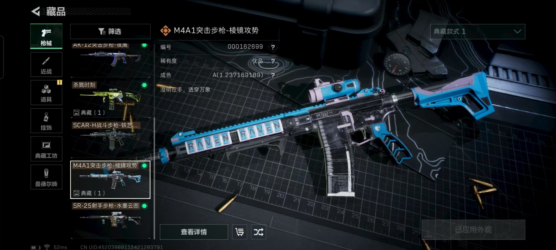 [11676374]总资产:287.5M 6传说枪械 哈夫币:66.145K 可二次 可修改实名 优质装备:K416突击步枪-命运(典藏),SCAR-H战斗步枪-电玩高手 烽火地带段位:钻石 全面战场段位:无段位 传说武器皮肤:SR-25射手步枪-水墨云图,SCAR-H战斗步枪-铁艺苍穹,AK-12突击步枪-夜鹰,SMG45冲锋枪-骑士