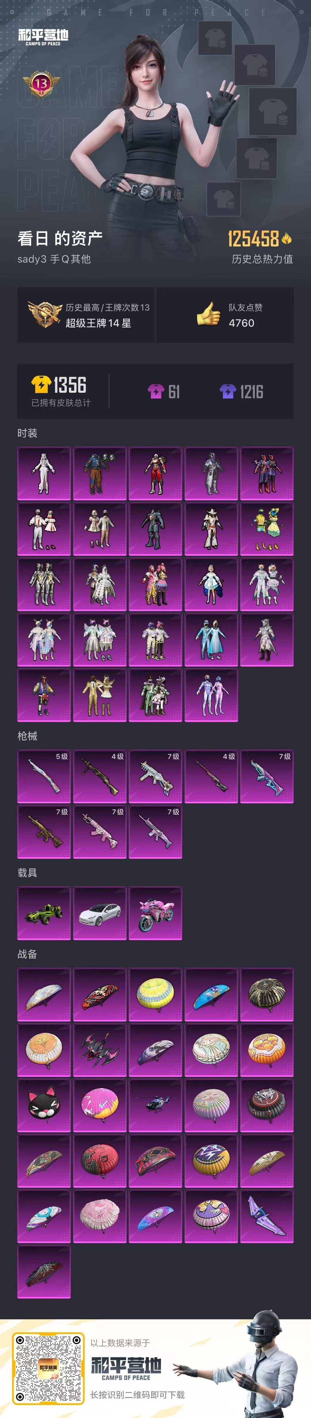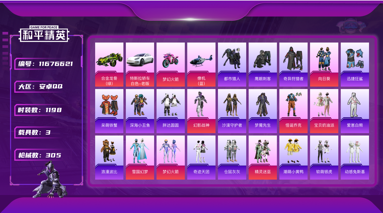 [11676621]24粉装 8特效枪 3载具 13印记 可二次 可修改实名 身法装备:都市猎人,暗影哥特(红眼罩),沙漠守护者,萌熊伴侣背包(粉熊背包) 优质装备:怪诞乔克(小丑),雪国幻梦(冰雪女王),特斯拉Model 3(珍珠白),合金龙骨(绿),都市猎人,沙漠守护者(黑丝),萌熊伴侣背包(粉熊背包),M762甜蜜誓约,M416五爪金龙,SCAR-L梦幻火箭,奇异狩猎者,梦幻火箭(新101)(新火箭少女101粉色套装),幻影战神,宝贝奶油派,金属狂野,缤纷油彩(猪妹猪脸妹),向日葵(套装-向日葵先生),香水柠檬,天禅智恒,绚金战神,冰霜白皇,银刃赛罗,精灵迷巫,狩月元帅,星之彼岸,UMP45相思残雪(UMP45-相思残雪),AKM梦之光华,AWM焰龙焚天,洛天依,DP-28暗夜鎏金,七级AKM-梦之光华,七级UMP45-相思残雪,七级M762-甜蜜誓约,七级SCAR-L-梦幻火箭,七级M416-五爪金龙,冷漠罗丽,Kar98K-巳巳如意 热门装扮:林间仙鹿,彩虹鹿灵,山涧鹿灵,复仇流浪者,荒漠赏金,冰川红玫,阿尔茜,S1赛事上衣,沙漠守护者,兔兔白日梦,动感兔斯基,软萌银虎,奇迹天团,胖达圆圆,潮萌小黄鸭,仓鼠灰灰,迅捷狂鲨,鹰眼刺客,呆萌铁蟹,梦魇先生,爱崽白熊,深海小丑鱼,浪漫波比,都市猎人 载具:空客H135-蔚蓝之翼,双人摩托-梦幻火箭 五级特效枪:五级Kar98K-巳巳如意 四级特效枪:四级DP-28-暗夜鎏金,四级AWM-焰龙焚天 紫色装扮:岑岑玉浪,琉璃情波,田园牧歌,轻风白浪,和煦暖阳,SS22特训,SS23特训,幻彩翩翩,妙红点点,白兰地假日,苍岚星,娇憨猪猪,夏雨游龙,萌趣咩咩,SS21特训,SS31特训套装,SS2特训,SS3特训,SS4特训,SS5特训,人气偶像,军械专家,冰原使者,,冰川特警,决胜时刻,冷焰舞者,凛冬战士,刚毅裁决者,北国孤狼,千禧之恋,旭日情侣,云朵鹅,雪绒豹,SS33特训套装,顶瓜瓜,灵公主,SS20特训,赛罗奥特曼,青春冒险家,潮流游乐家,SS15特训,暗夜傀儡,蝎王蛇后,迪迦奥特曼,欧布奥特曼,时空追击者,暴风机械师,星辰守护者,SS16特训,爆裂葡萄,冰爽海盐,闪金天王,银白舞王,SS13特训,暗黑裁决,诡谋托雷基亚,浪漫樱花,星梦畅游,治愈之星,迅捷之星,科技之星,SS14特训,萌趣颜团子,特种颜团子,暖风夏荷,猎梦纪元,