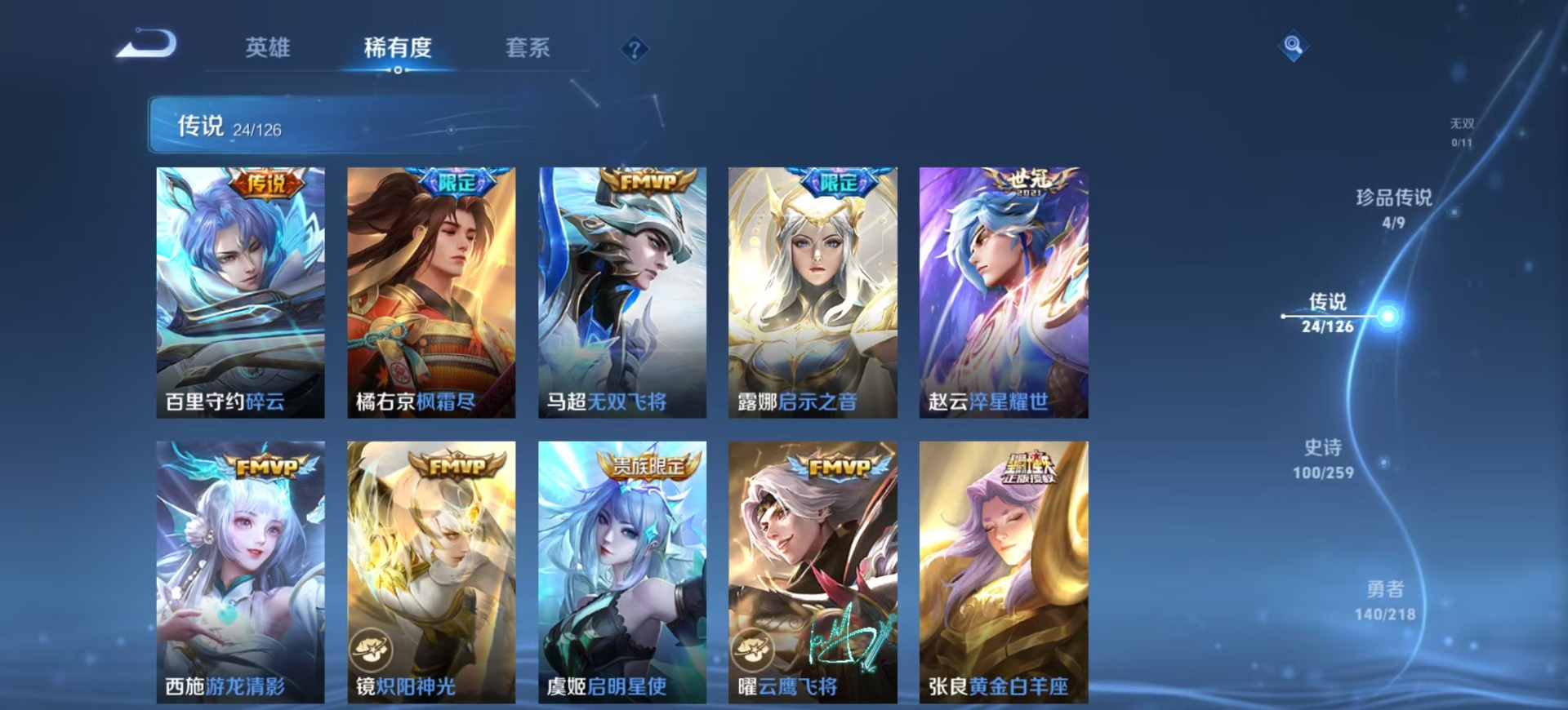 - PX_2095395-99 安卓QQ/至尊星耀/216皮肤/124英雄/2典藏/0珍品无双/0无双/1珍品传说/16传说/74史诗/8稀有英雄 【1 珍品传说】怪盗基德 马可波罗, 【2 典藏皮肤】银白咏叹调 铠,最初的交响 伽罗, 【16 传说皮肤】逐花归海 澜,浮生妄 夏洛特,祈雪灵祝 公孙离,黄金射手座 后羿,久胜战神 干将莫邪,山海·炽霜斩 李信,音你心动 小乔,妄想奇谈 上官婉儿,妄想实