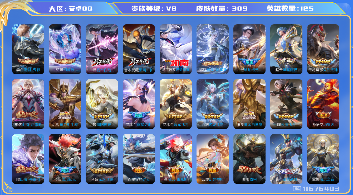 [11676403]V8 2典藏 4珍品传说 24传说 125英雄 309皮肤 可修改实名 优质装备:鸣剑·曳影,幻阙歌(貂蝉典藏),怪盗基德,器灵·落星盏,朽木白哉,黑崎一护,黄金射手座,冠军飞将,云鹰飞将(小将军),黄金白羊座,久胜战神,炽阳神光,地狱火,游龙清影(小青龙),淬星耀世,无双飞将,碎云,山海·炽霜斩(李信年限),山海·苍雷引(电光曜子),燃星之曲,电玩·雷克斯,琥珀纪元铠,琥珀纪元马超 传说皮:幻光神枪 珍宝阁皮:妄想食味,女武神 限定皮:愿照·千秋盛(女娲年限),逐霄战戟,陌上桑,鸣野蒿,神威(电光马子),高山流水,齐天大圣,五谷丰年,梁祝,岱宗(典韦年限),启示之音,枫霜尽,山海·玄木吟(马可年限) 史诗皮:鸭鸭历险记-刘禅,器灵·浮梦炉,化蝶舞,星界战将,龙之律动,石田雨龙,百相守梦-周瑜,茶境仙,海诺心动手记,破空之剑,战舞者,涂山红红,东方月初,蒙犽顽岩魄,埋骨钱,芈月浮光幕影,怒海争锋,谪仙醉月,上官婉儿群星魔术团,蔬乡物语(鲁班七号),琥珀纪元伽罗,百相守梦-百里守约,炽弈燎原,紫霞仙子,苍穹之光,电玩小子(小书包),黄金分割率,特工魅影,千年之狐,永昼,匿光破解者,江河有灵,雪夜绮愿(周瑜),百解令(蒙犽),高渐离燃音魔法,蒙恬荣光圣徽,偶像歌手,龙骑士(小龙虾),白蛇,暗夜猫娘,无限星赏官,晚萤,青蛇,末日机甲-吕布,猫狗日记-孙策,猫狗日记-大乔,节奏热浪,修罗,女仆咖啡,摇滚巨星,水果甜心,天才门将,星夜王子,心灵骇客,功夫厨神,德古拉伯爵,暗隐猎兽者,幽灵船长,鬼剑武藏,心灵战警,乐园奇幻夜,舞动绿茵,纤云弄巧,拒霜思,缤纷独角兽,乘风破浪,逐浪之夏,龙鼓争鸣,水晶猎龙者,曙光守护者,箭羽风息,金属风暴,原初追逐者,圣诞狂欢,圣诞恋歌,鹰眼统帅,暗夜贵公子,魅力维加斯,黎明之约,无心