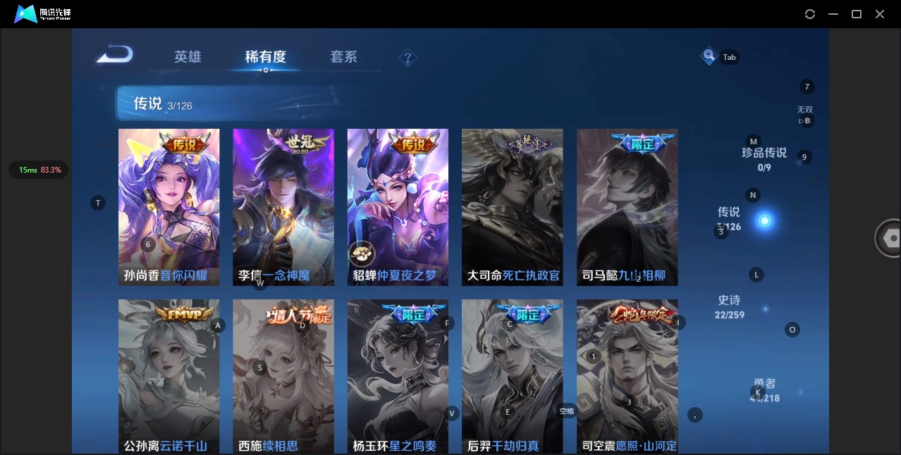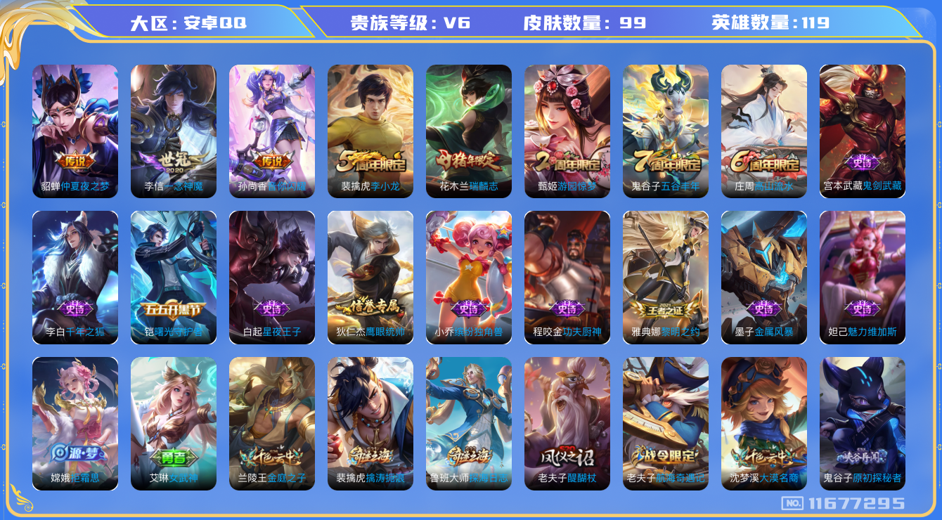 [11677295]V6 3传说 119英雄 99皮肤 可修改实名 优质装备:一念神魔,仲夏夜之梦(大飞蛾),音你闪耀(rap皮) 珍宝阁皮:女武神 限定皮:瑞麟志(木兰年限),高山流水,五谷丰年,游园惊梦,李小龙 史诗皮:千年之狐,星夜王子,功夫厨神,鬼剑武藏,拒霜思,缤纷独角兽,曙光守护者,金属风暴,鹰眼统帅,魅力维加斯,黎明之约