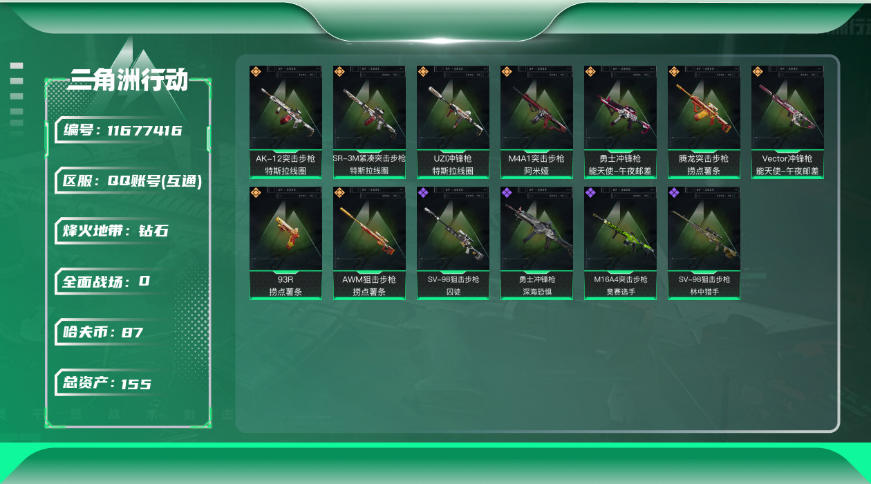 [11677416]总资产:155.3M 9传说枪械 哈夫币:87.322K 进阶安全箱(9.17到期) 可二次 可修改实名 烽火地带段位:钻石 全面战场段位:无段位 传说武器皮肤:M4A1突击步枪-阿米娅,AWM狙击步枪-捞点薯条,腾龙突击步枪-捞点薯条,93R-捞点薯条,AK-12突击步枪-特斯拉线圈,SR-3M紧凑突击步枪-特斯拉线圈,UZI冲锋枪-特斯拉线圈,勇士冲锋枪-能天使-午夜邮差,Vector冲锋枪-能天使-午夜邮差 史诗武器皮肤:M16A4突击步枪-竞赛选手,勇士冲锋枪-深海恐惧,SV-98狙击步枪-林中猎手,SV-98狙击步枪-囚徒