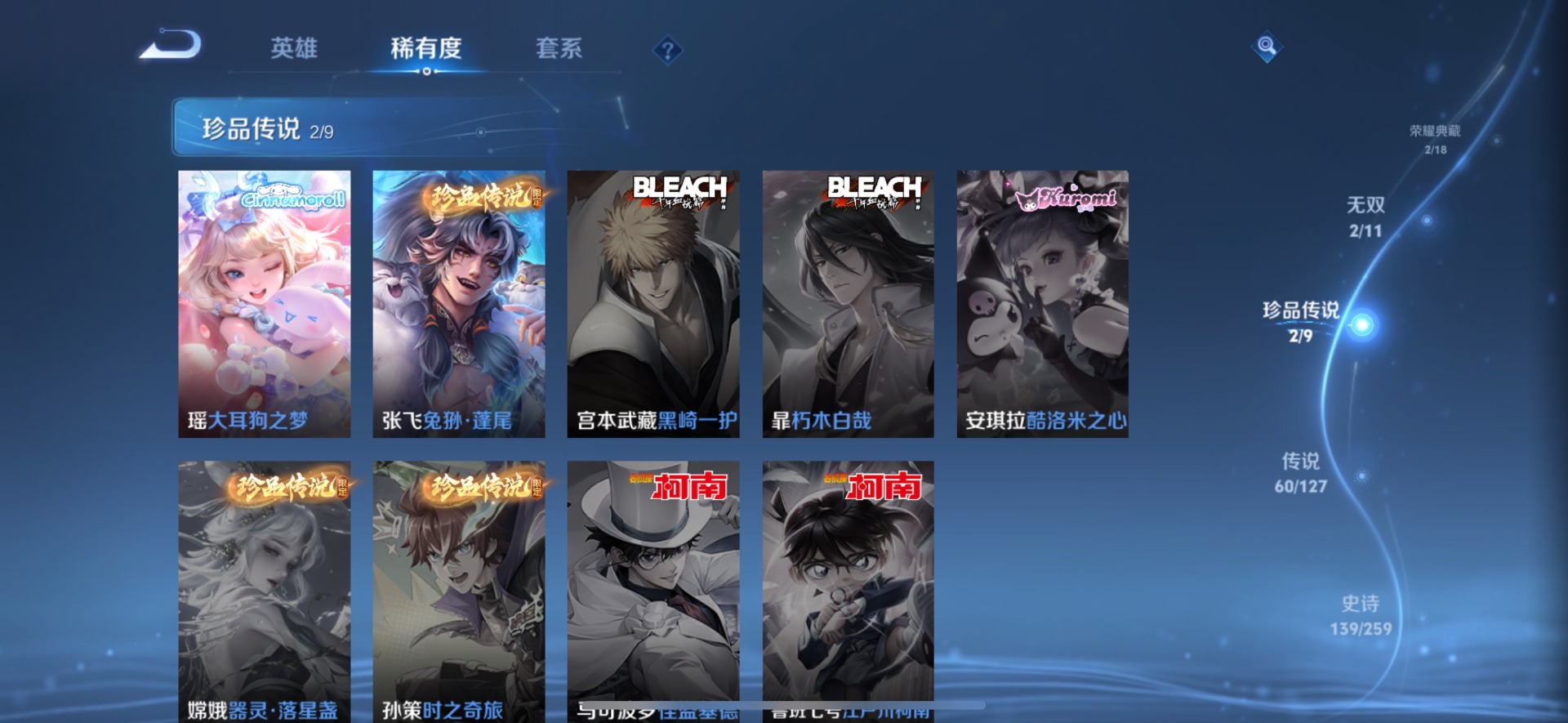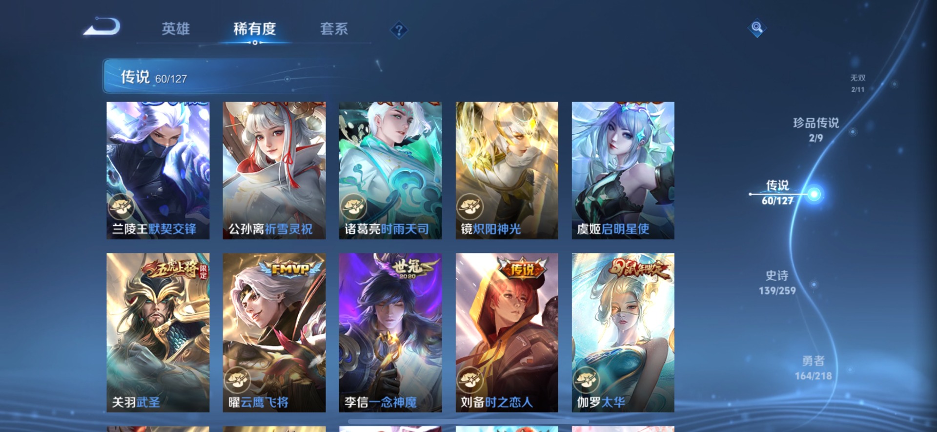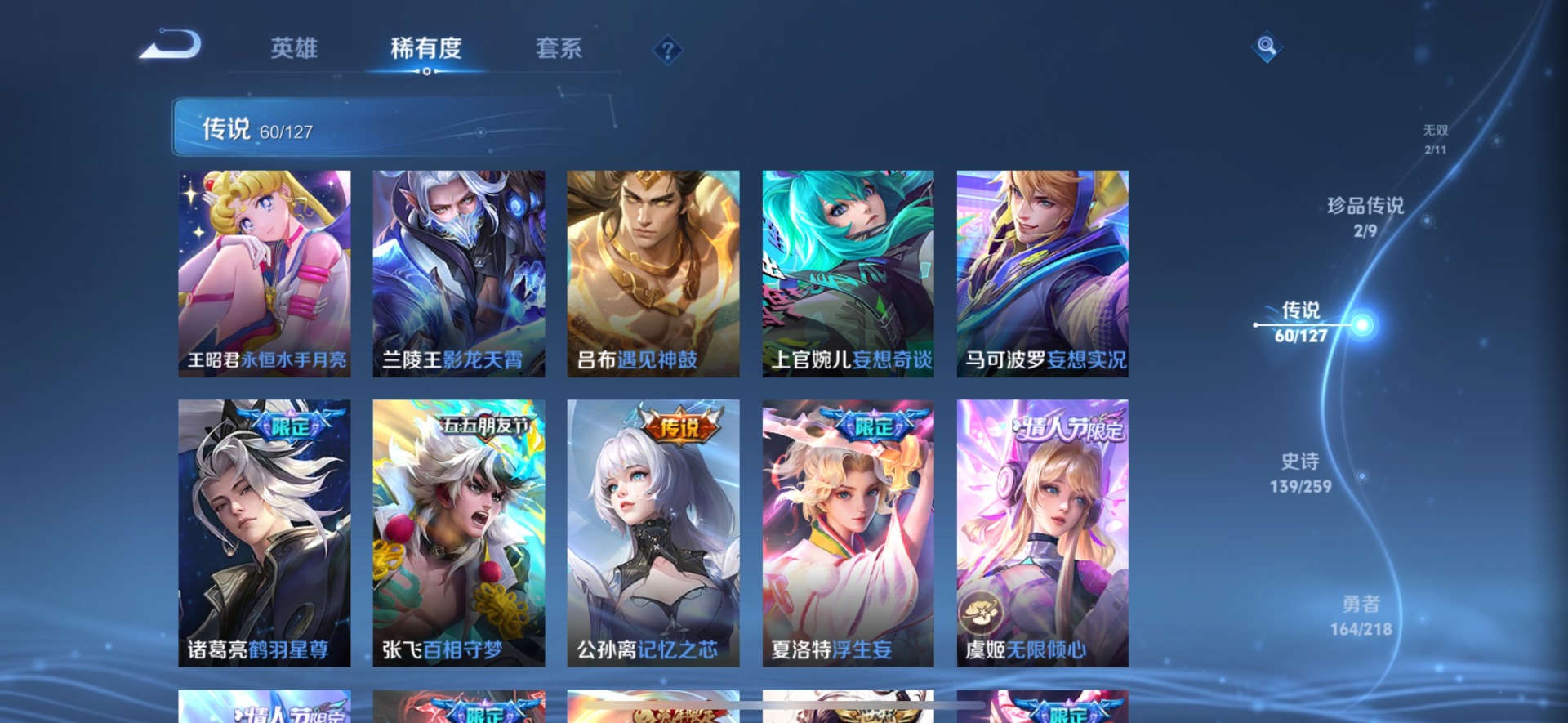 - PX_2102677-实名: 可修改 贵族等级: V4 英雄数: 119 皮肤数: 87 传说皮: 星之鸣奏 限定皮: 五谷丰年,至美·乘鲤谣,鸣野蒿,愿照·众生和