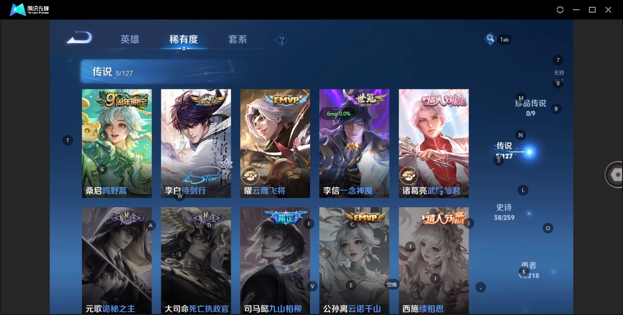 - [11684690]V5 1典藏 3传说 123英雄 124皮肤 可修改实名 优质装备:鸣剑·曳影,云鹰飞将(小将军) 传说皮:九山相柳 珍宝阁皮:妄想食味 限定皮:愿照·九州拓(澜年限),傲雪梅枪,时之祈愿-云中君 史诗皮:器灵·浮梦炉,百相守梦-黄忠,白龙吟,黄金分割率,偶像歌手,魅语,猫狗日记-孙策,摇滚巨星,水果甜心,天才门将,幽灵船长,逐浪之夏,鹰眼统帅,魅力维加斯,未来纪元-赵云