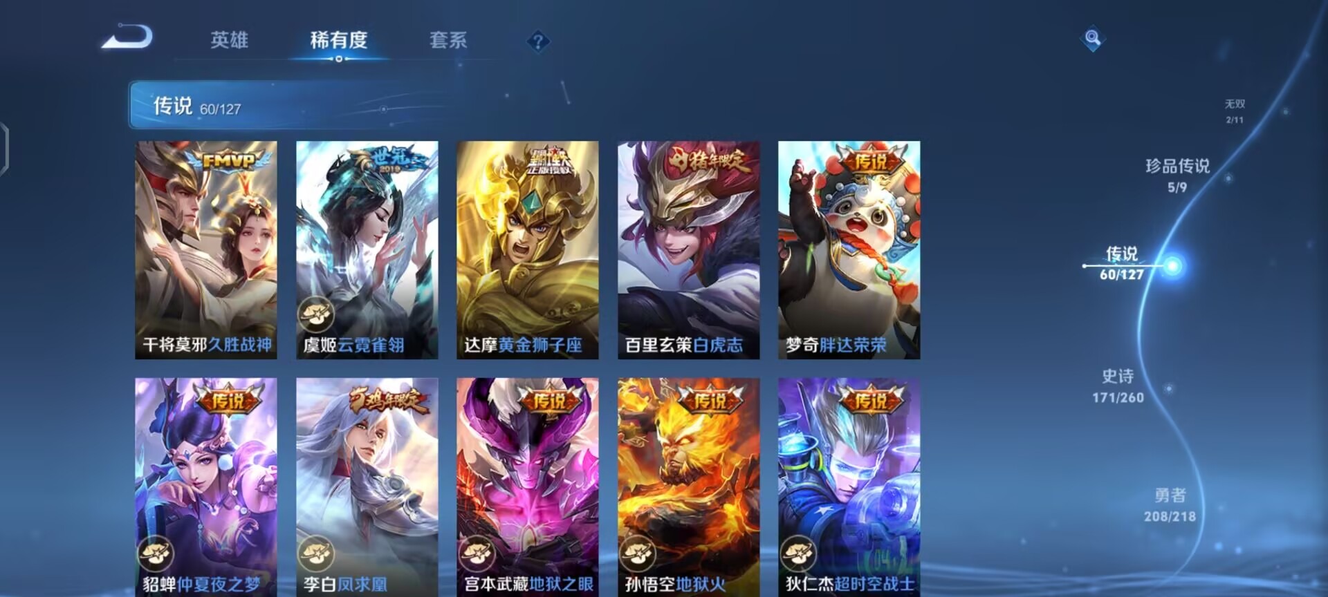 夏侯惇朔风刀,老夫子醍醐杖,盾山御銮,曹操烛龙,苏烈千军破阵,牛魔御旌,项羽苍威无极,镜青焰无极,裴擒虎擒涛扼浪,蒙犽狂想玩偶喵,马可波罗暗影游猎,鬼谷子原初探秘者,张良古海寻踪,嬴政白昼王子,芈月重明,扁鹊炼金王,虞姬凯尔特女王,米莱狄御霄,刘邦夺宝奇兵,沈梦溪星空之诺,沈梦溪大漠名商,孙膑妖精王,典韦穷奇,典韦蓝屏警告,达摩沙漠行僧,鲁班七号狮舞东方,吕布猎兽之王,元歌云间偶戏,兰陵王金庭之子,鲁班大师探海日志,明世隐疑决卦,白起狰,女娲朔望之晖,桑启海盐诗旅,狄仁杰万华元夜,程咬金演武夺筹,李元芳银河之约,李元芳云中旅人,弈星混沌棋,钟馗神迹守卫,钟馗驱傩正仪,狂铁御狮,太乙真人饕餮