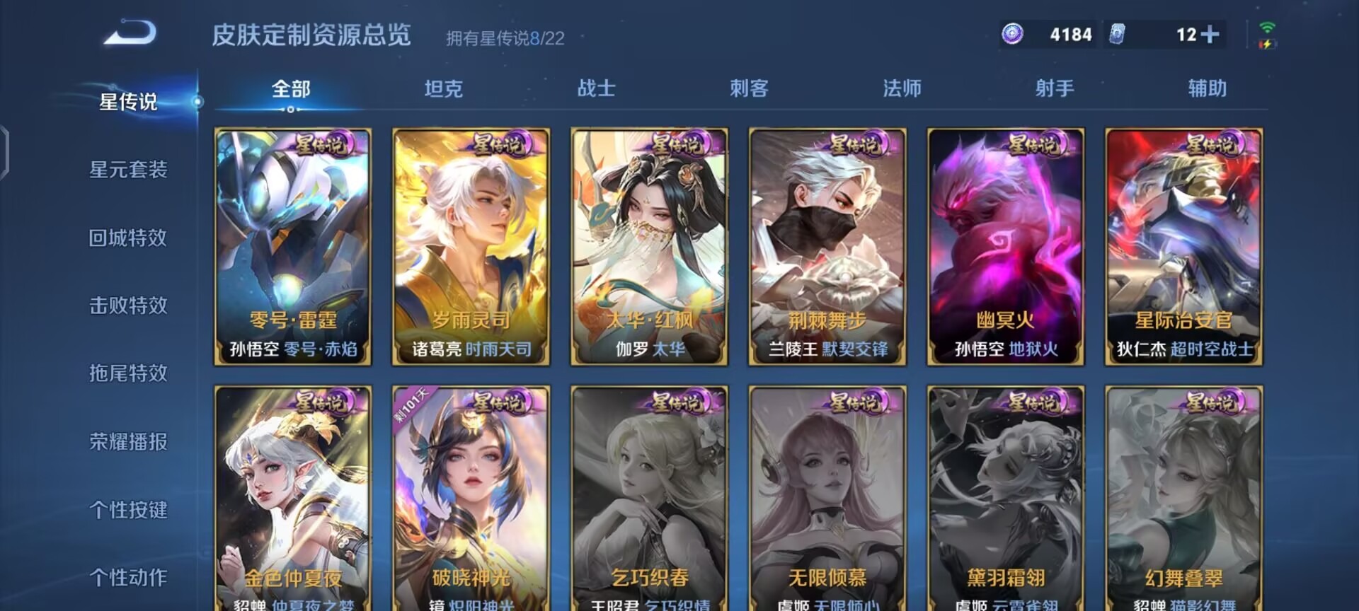 夏侯惇匿光决锋者,夏侯惇霜北刀,黄忠烈魂,老夫子圣诞老人,盾山梦圆繁星,孙尚香异界灵契,牛魔奔雷神使,露娜启示之音,露娜一生所爱,诸葛亮时雨天司,司空震愿照·山河定,裴擒虎李小龙,裴擒虎天狼狩猎者,裴擒虎寅虎·赤拳,上官婉儿梁祝,花木兰默契交锋,马可波罗山海·玄木吟,猪八戒猪悟能,芈月白晶晶,孙悟空至尊宝,雅典娜神奇女侠,韩信飞衡,澜愿照·九州拓,虞姬霸王别姬,虞姬愿照·岁时盈,王昭君映山客,大乔白鹤梁神女,铠青龙志,伽罗天狼溯光者,伽罗太华,孙膑天狼运算者,吕布御风骁将,后羿如梦令,兰陵王默契交锋,公孙离祈雪灵祝,李白诗剑行,艾琳陌上桑,桑启鸣野蒿,女娲愿照·千秋盛,百里玄策白虎志,赵云引擎之心,盘古冰霜神祇,妲己愿照·众生和,蔡文姬愿照·福禄聚,关羽武圣,关羽冰锋战神